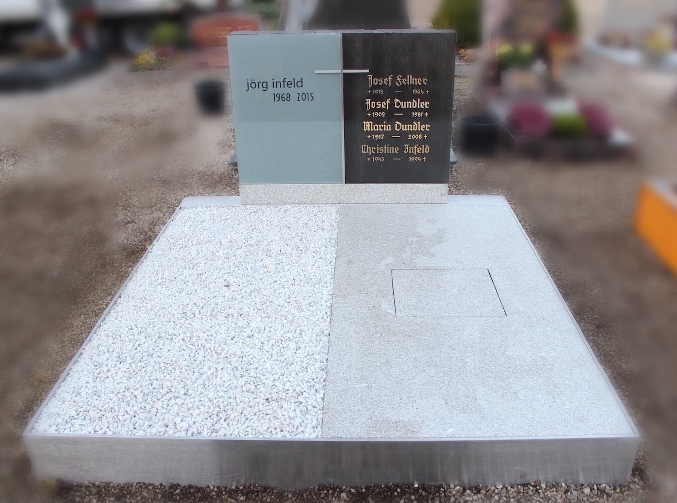 Doppelgrab Infeld Details Name: Infeld Standort: Frankenmarkt Grabstein: Das perfekte Beispiel, wie eine bestehender Grabstein in eine Neugestaltung der Grabstätte integriert werden kann. Im rechten Teil der Bodengestaltung ist ein herausnehmbarer Deckel, um zum integrierten Urnenkasten zu gelangen.