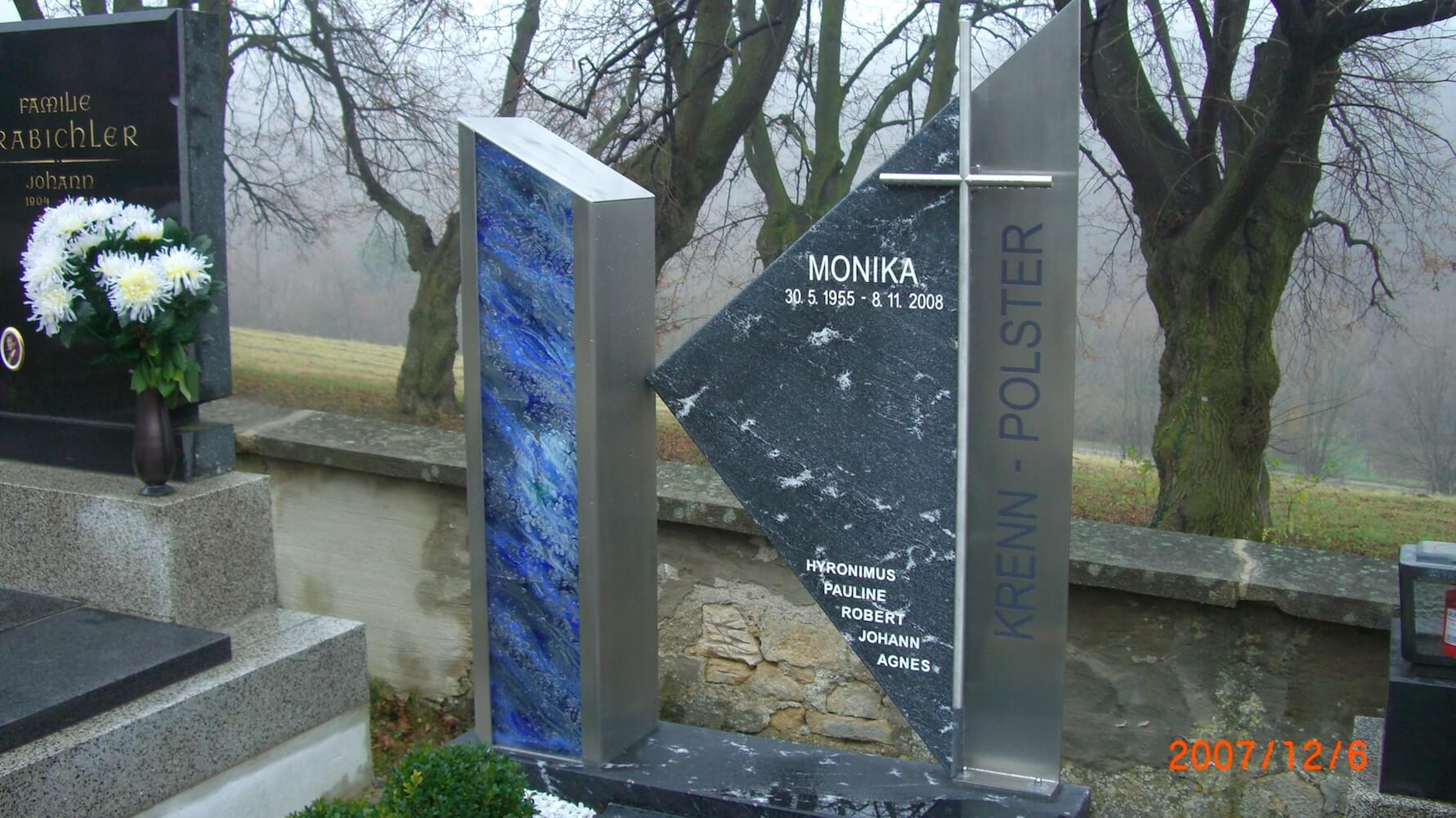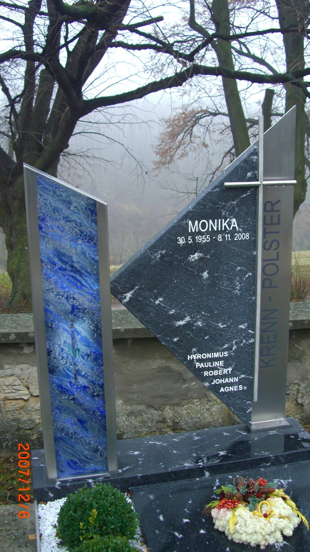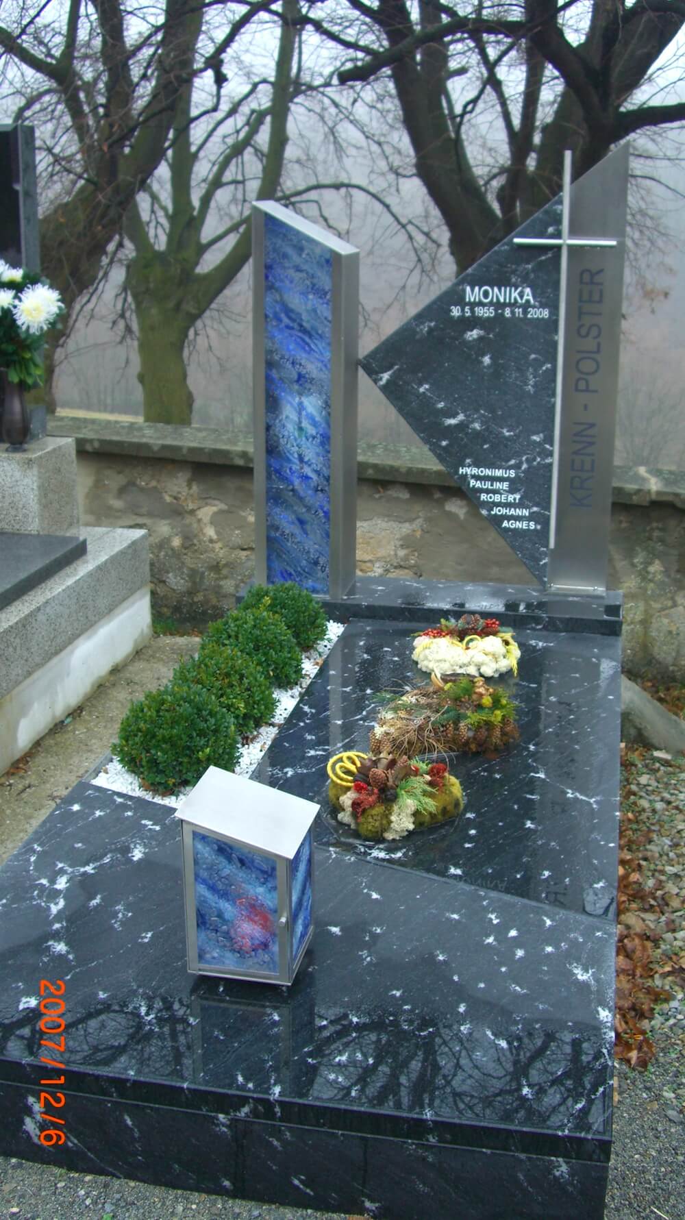 Grabstein: Nero Via Lactea ist ein Naturstein aus Brasilien, der durch seine schöne Struktur und Farbe auffällt. Hinter dem blauen Schmelzglas der Säule ist Platz für drei Urnen. Bei einem Sichturnensysteme erspart man sich das Einlassen der Urne ins Erdreich.