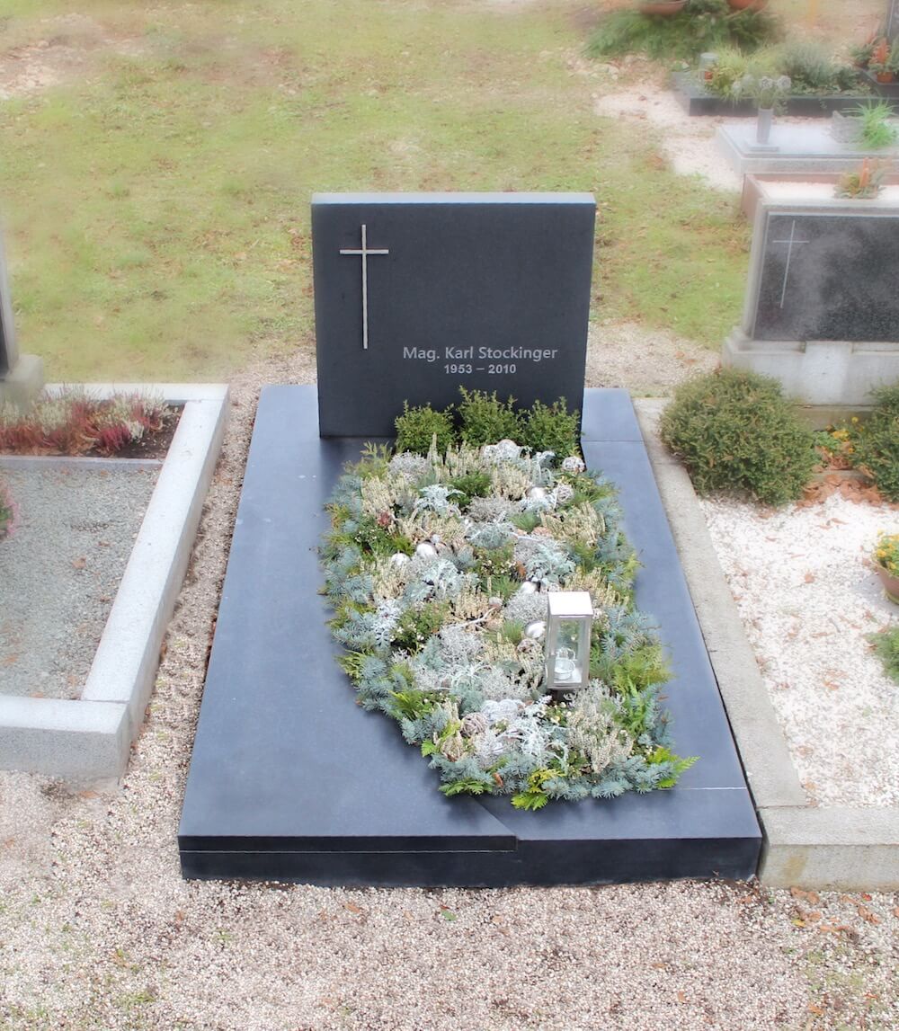 Doppelgrab Mag. Stockinger Details Name: Mag. Stockinger Standort: Wels Grabstein: Die gebogene Line von Fußende zum Grabstein soll die Verbindung zum Verstorbenen aufbauen. Der schlichte Entwurf und das matte Schwarz des berarbeiteten Material „Schwarz Schwedisch“ ergänzen sich perfekt.