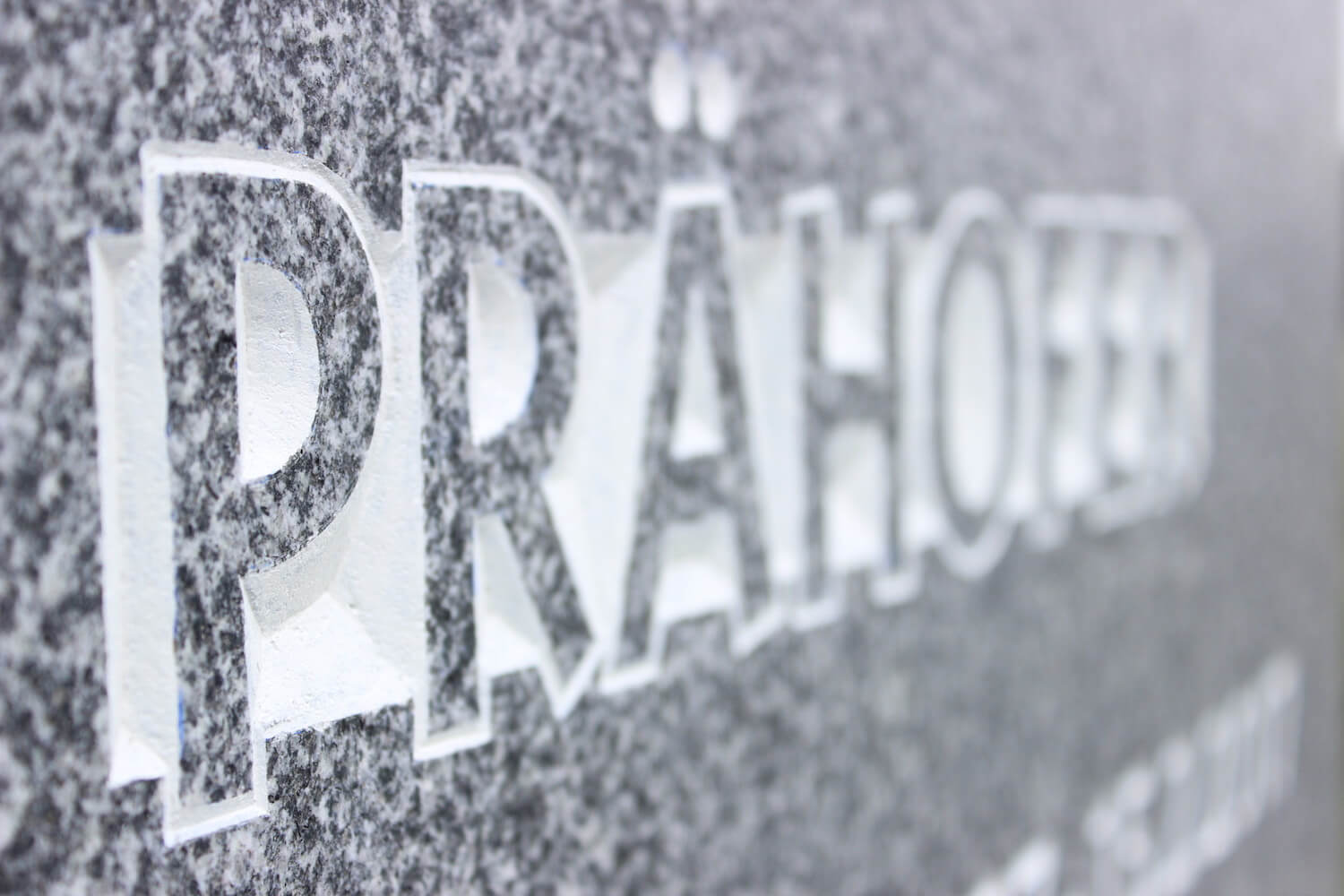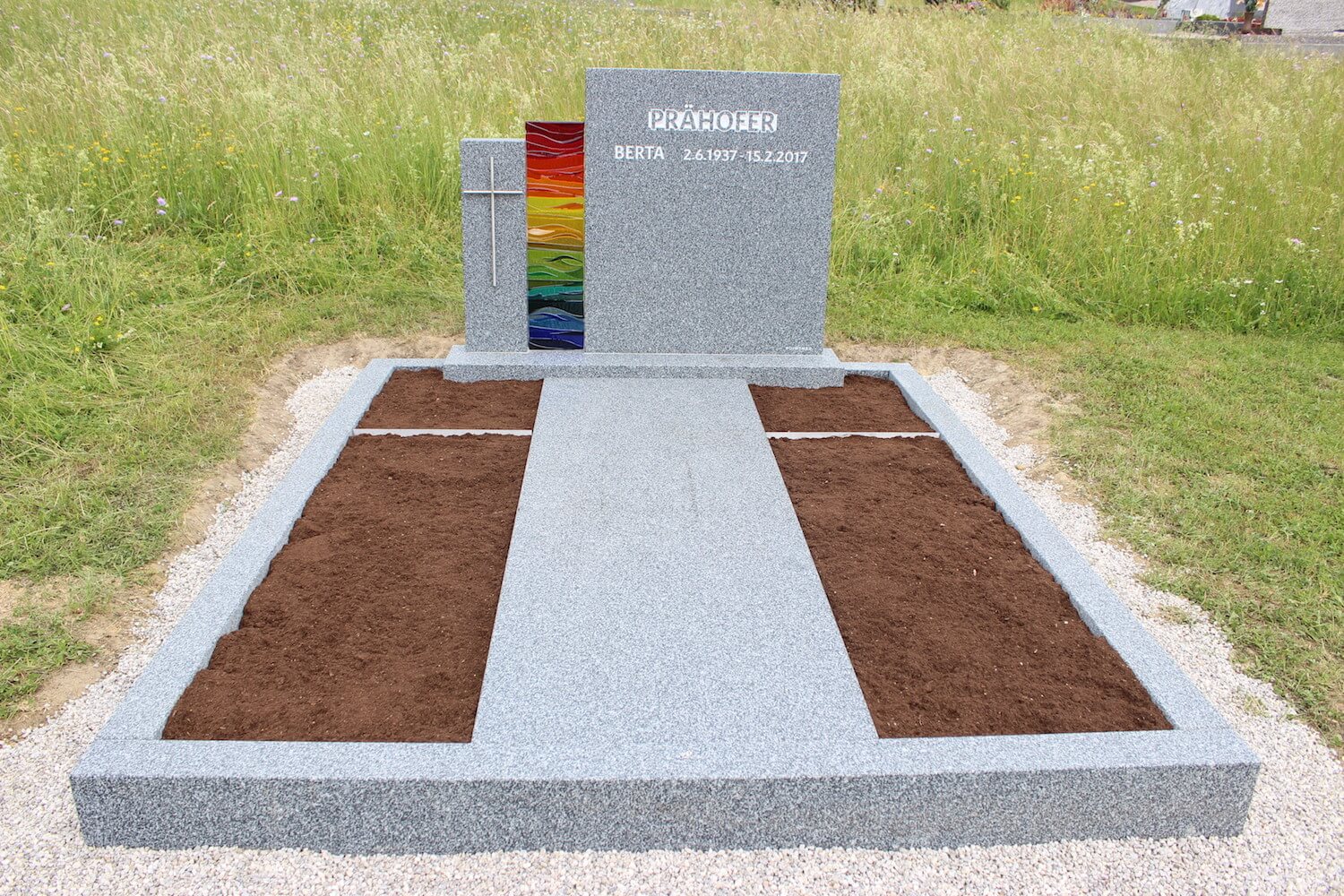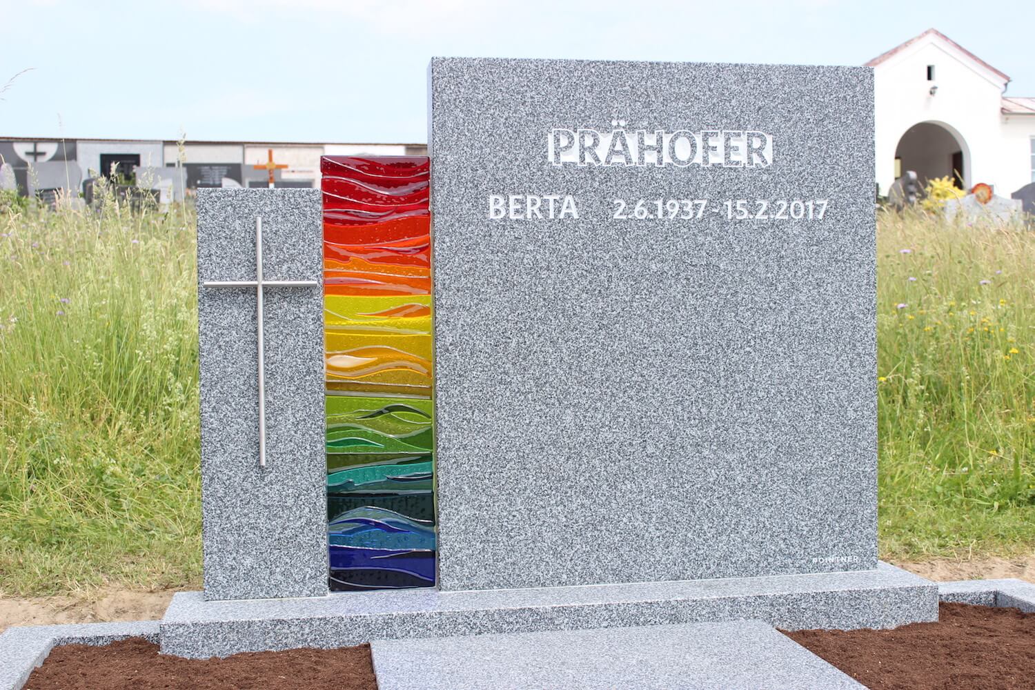 Grabstein: Das verwendete Material Fürstensteiner Diorit aus Bayern mit gebürsteter Oberfläche und seiner strukturierten Eigenschaft, sollte sich bei der Gestaltung im Hintergrund halten. Der Fokus liegt klar auf dem handgefertigten Schmelzglas und dem Schriftzug.