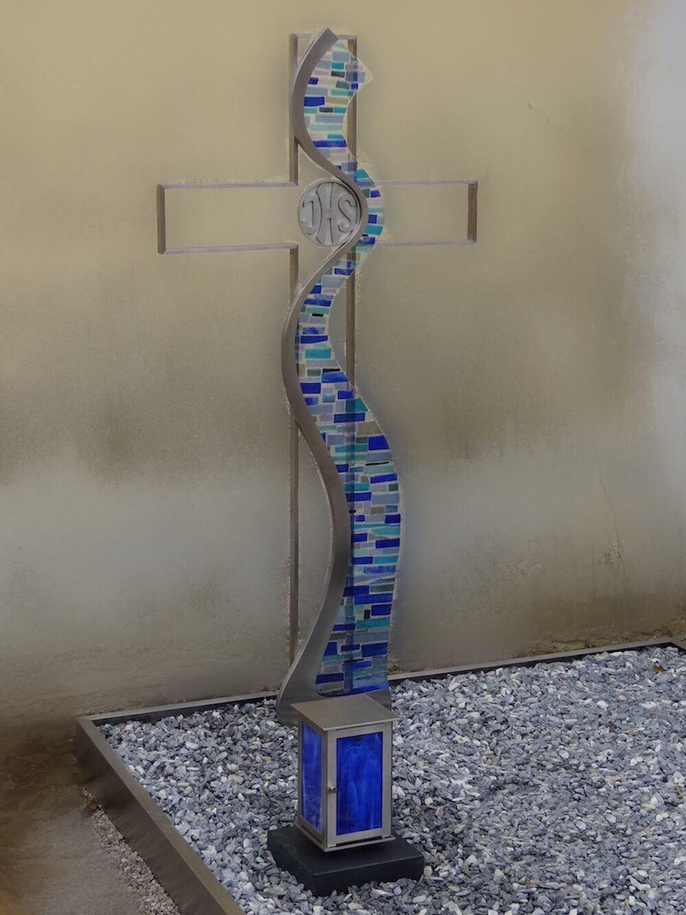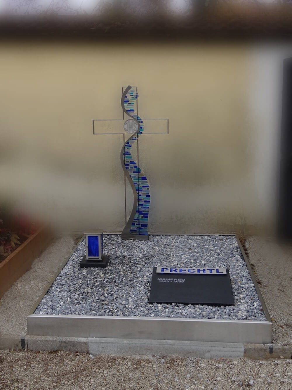 Grabstein: Dieses Kreuz aus Edelstahl mit Schmelzglas wurde nach unserem eigenen Entwurf extra für uns gefertigt und ist eine neue Sichtweiße „traditionelle“ Kreuze zu gestalten. Das Schmelzglas ist dank unserer hauseigenen Glaswerkstätte individuell an den Bedürfnissen des Kunden angepasst.