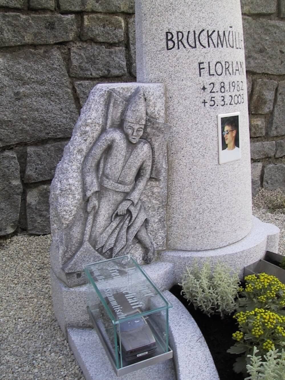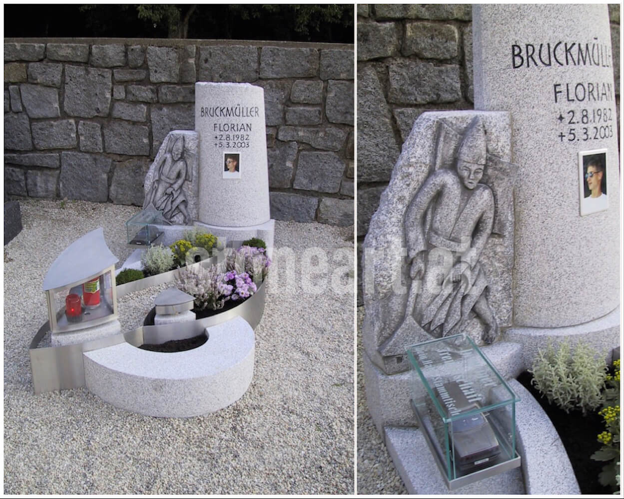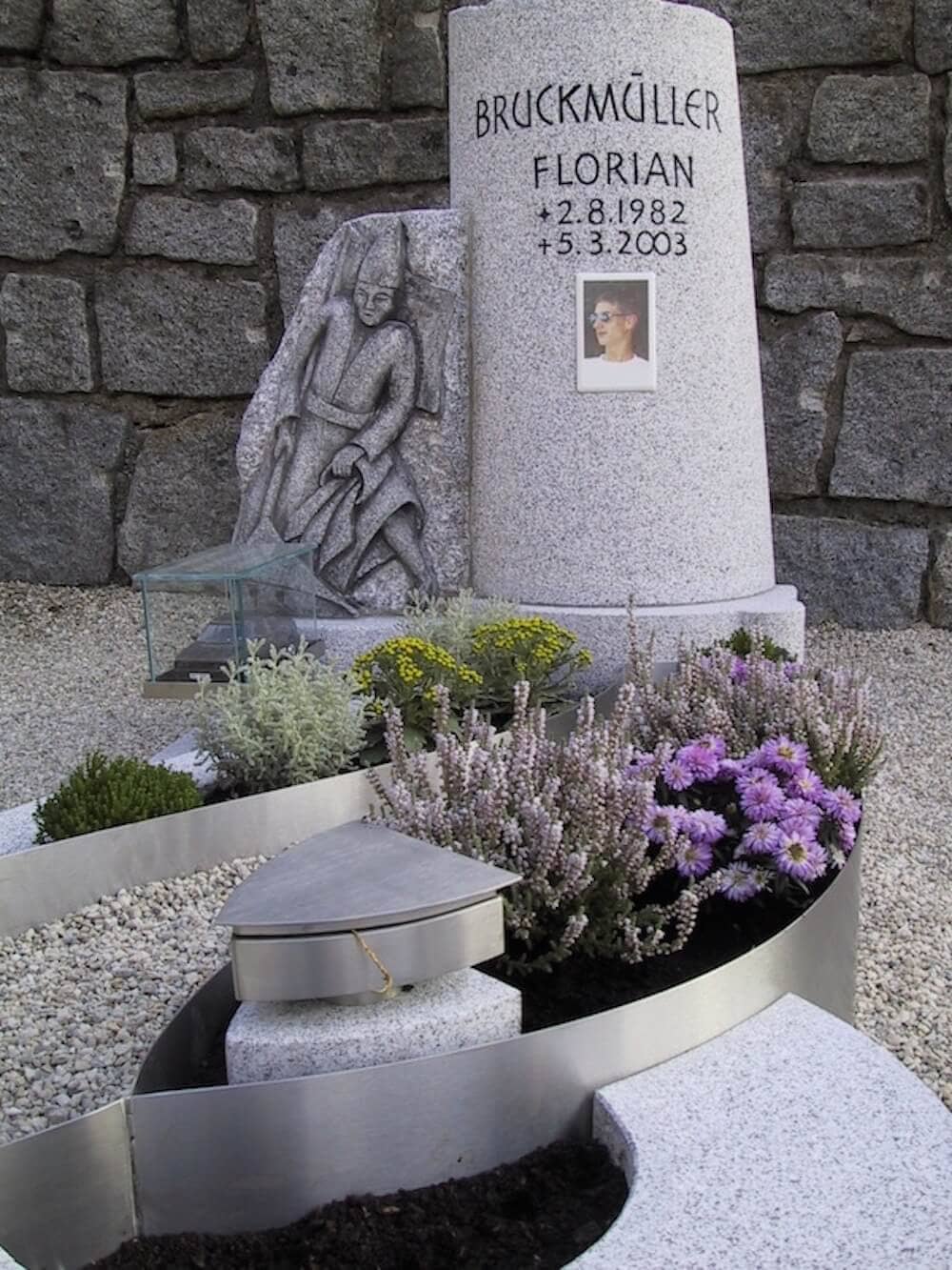 Grabstein: Bei dieser Grabmalgestaltung wurden alle Flächen handwerklich bearbeitet, es gibt keine polierten Natursteinoberflächen. Der aus eigenem Entwurf gearbeitete Hl. Florian wurde auf den modernen Stil des Grabs abgestimmt. Als Ergänzung kommt zeitloser und pflegeleichter Edelstahl zum Einsatz. Entwurf und Ausführung 2003!