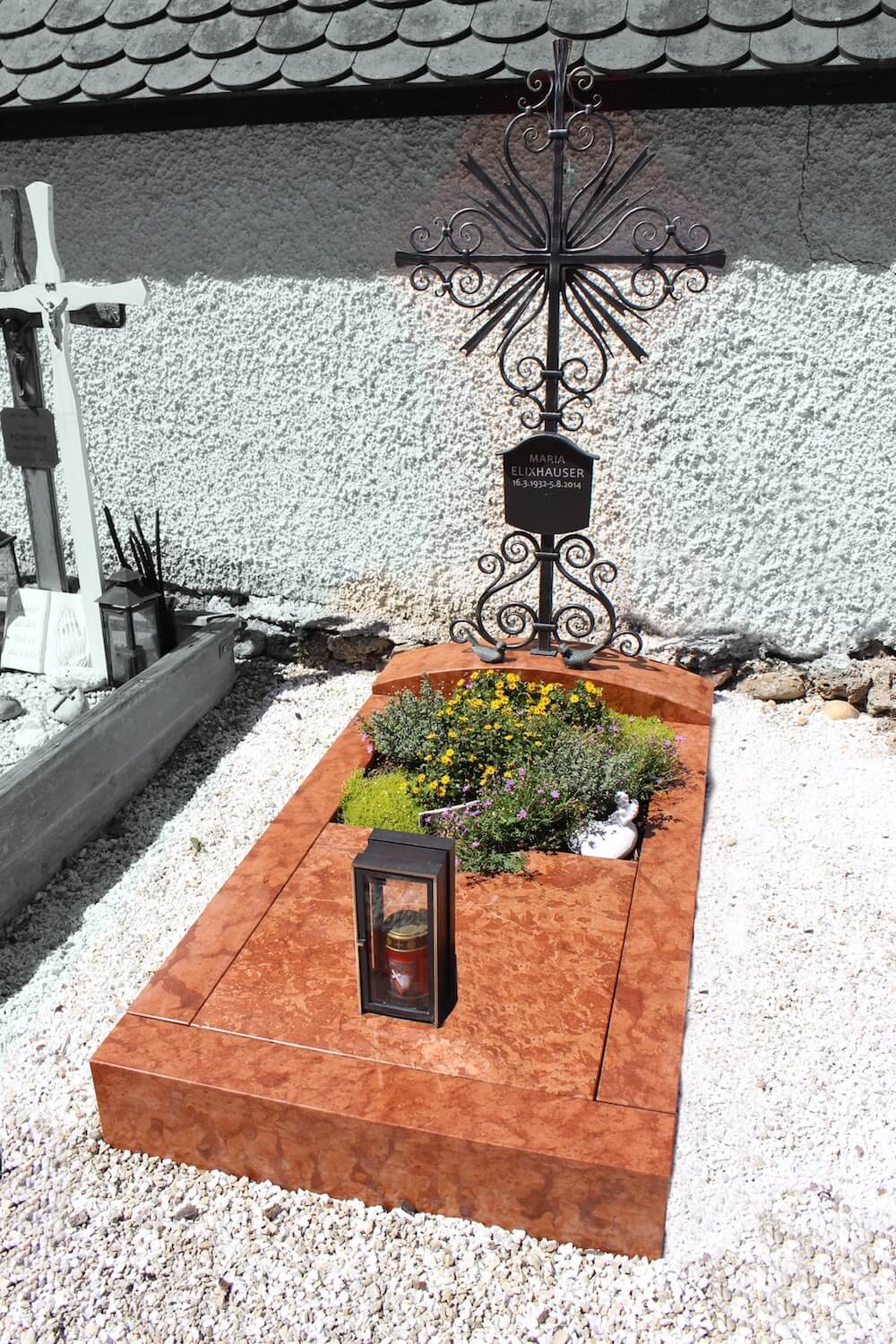 Einzelgrab Elixhauser Details Name: Elixhauser Standort: Weißkirchen Grabstein: Ungarisch Rot heißt das verwendete Material bei dieser Grabeinfassung. Der leicht gebogen Kreuzstein passt sich mit seiner Rundung an das Schmiedeeisenkreuz an.