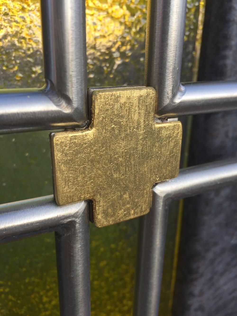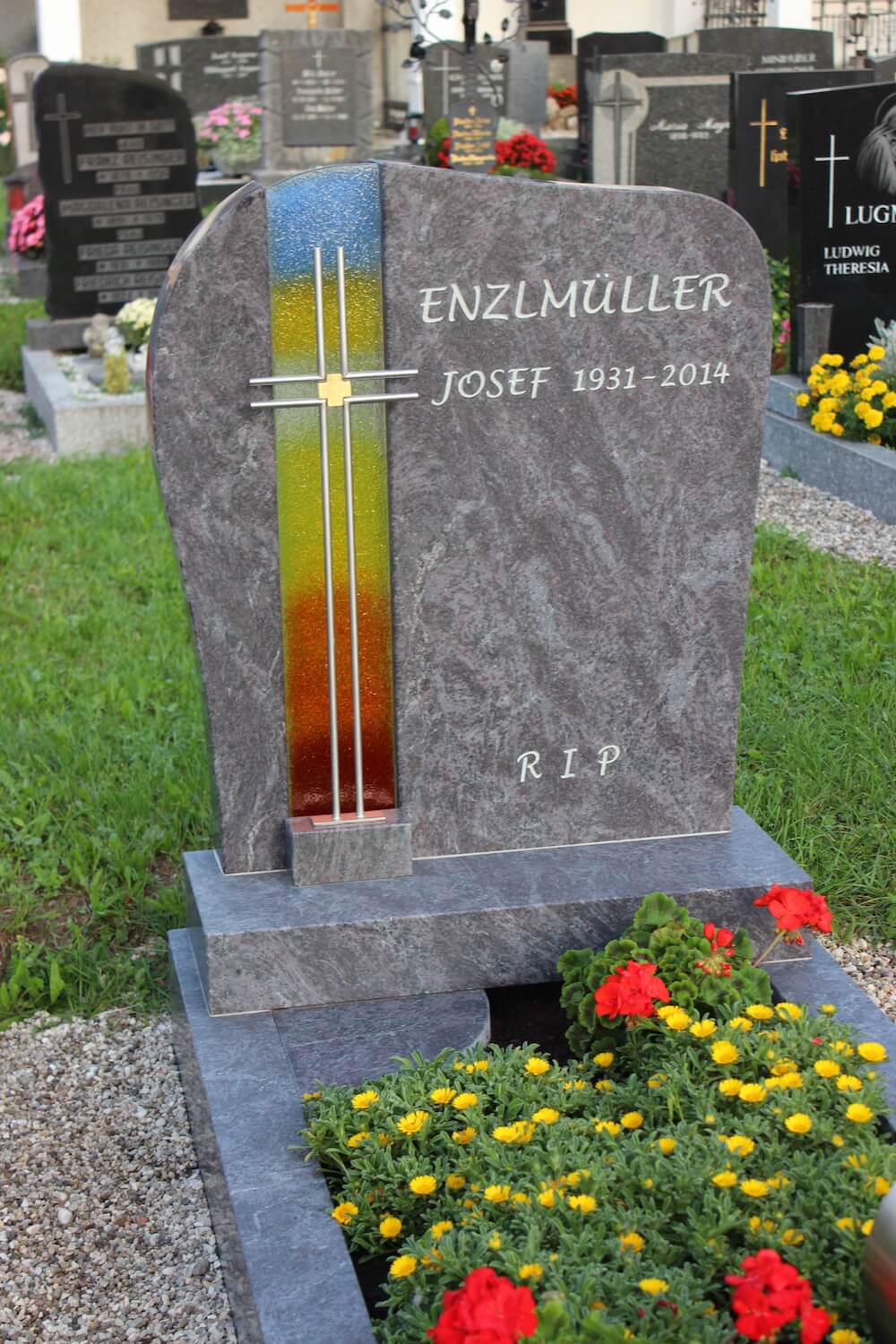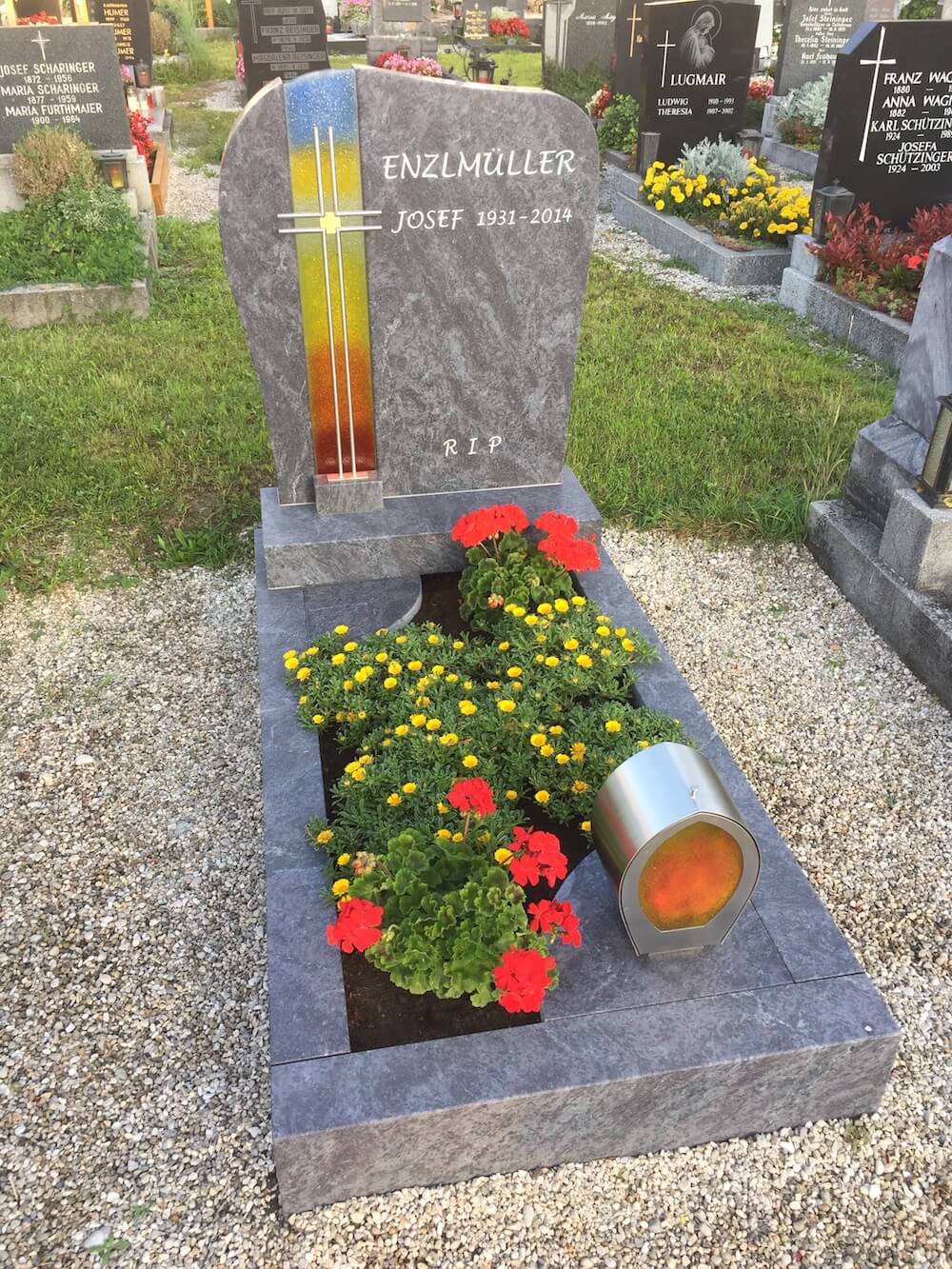 Grabstein: Das Material „Orion Granit“ sieht man meist nur als polierte Bearbeitung. Eine glänzende Oberfläche würde jedoch nicht zu dieser Gestaltung passen. Wir haben passend zum Zubehör, die Bearbeitung in matter Ausführung gemacht. Das Kreuz in der Mitte wurde mit Echtgold belegt.