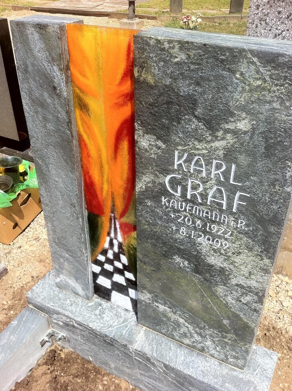 Grabstein: Das Schachbrettmuster symbolisiert den Verstorbenen, der leidenschaftlicher Schachspieler war. Das Ableben, der Übergang ins Jenseits und die damit verbundene schmerzhafte Erfahrung für die Angehörigen kommen in diesem Schmelzglas zum Ausdruck.