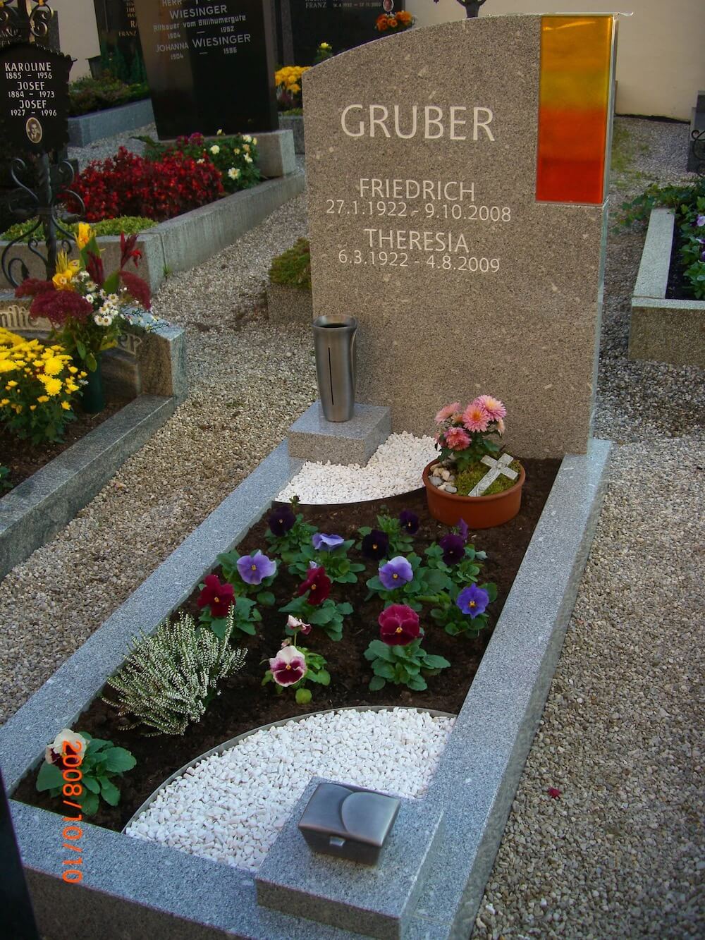 Einzelgrab Gruber Details Name: Gruber Standort: Aistersheim Grabstein: Das als Gestaltungselement verwende Schmelzglas ist gleichzeitig eine Ecklaterne. Ohne sich bücken zu müssen, kann man die Grablichter tauschen.