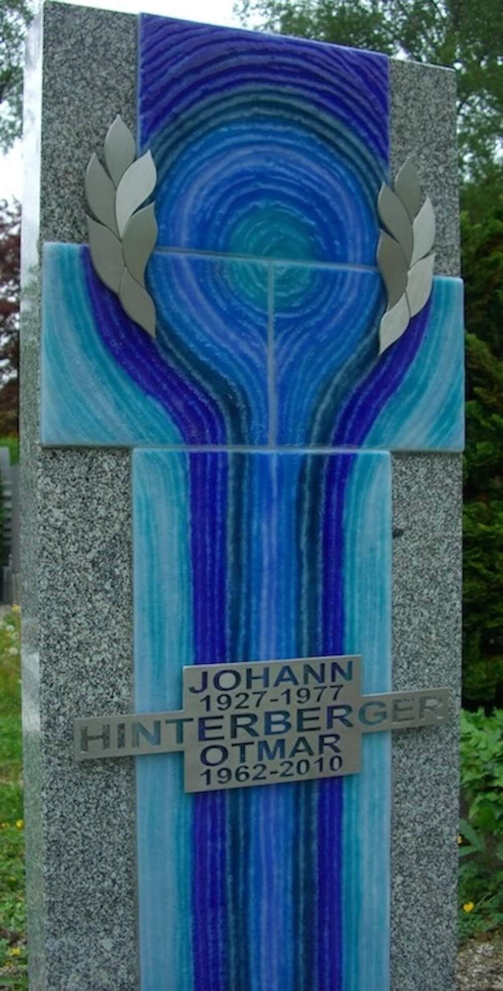 Einzelgrab Hinterberger Details Name: Hinterberger Standort: Wels Grabstein: Das Schmelzglas ist hier die Dominate und das formgebende Objekt sowie eine Anlehnung an die künstlerische Arbeit.