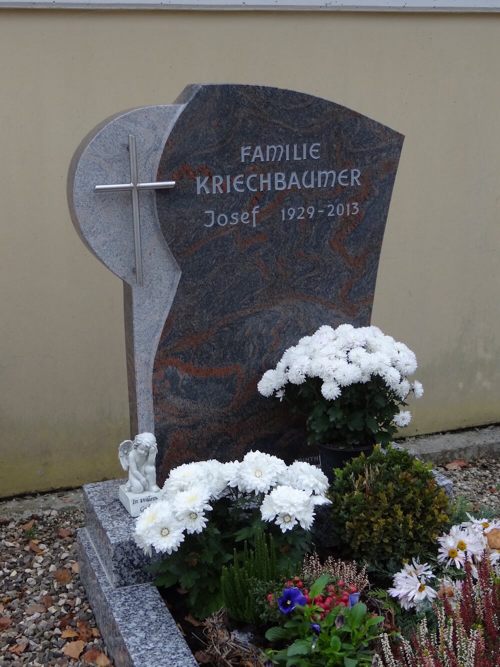 Einzelgrab Kriechbaumer Details Name: Kriechbaumer Standort: Wendling Grabstein: Natursteinkombinationen sind bei der Gestaltung eines Grabsteins nicht immer notwendig. Bestimmende Formen und unterschiedliche Bearbeitungen des Steins, verleihen ihm ein stimmiges Aussehen.