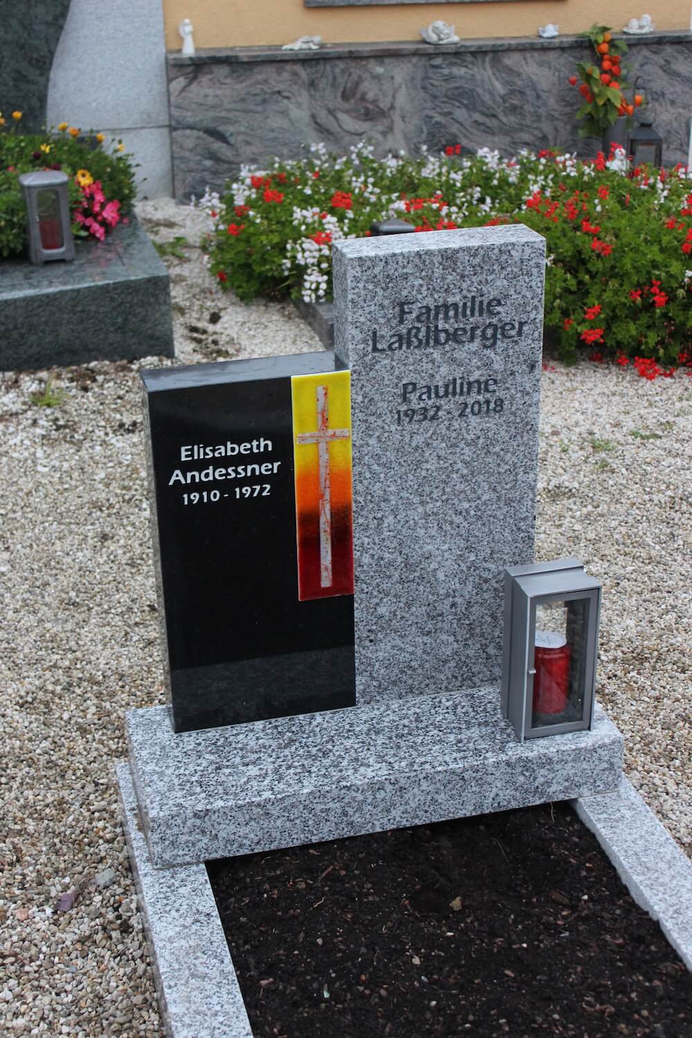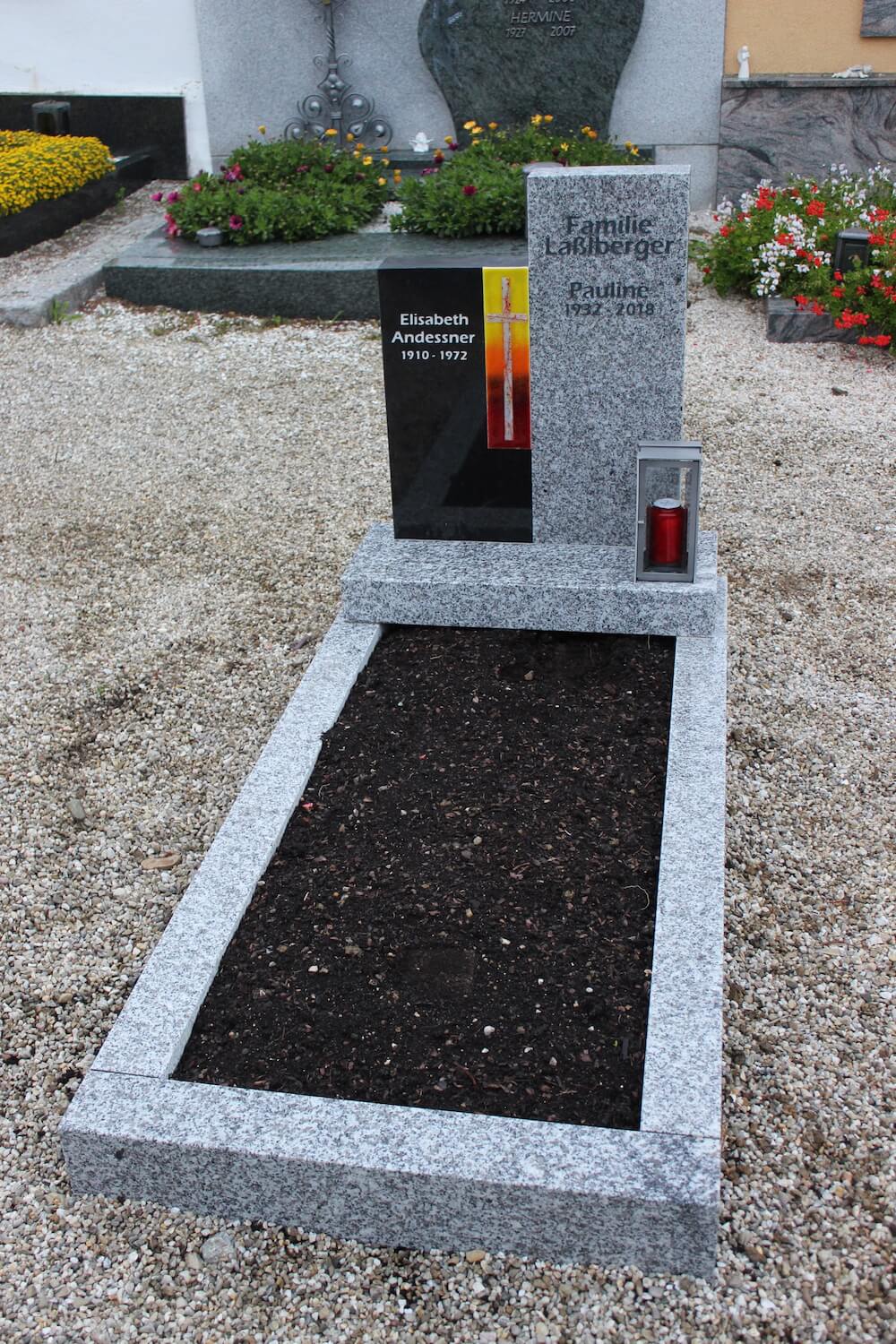 Grabstein: Im Zuge der Umgestaltung der Grabanlage wurde der bestehende schwarze Stein abgeschliffen und in eine neue Form geschnitten. Jetzt ist er ein Teil des neu gestalteten Grabsteins. Die Geschichte des alten Grabsteins wird in die neue Gestaltung miteinbezogen.