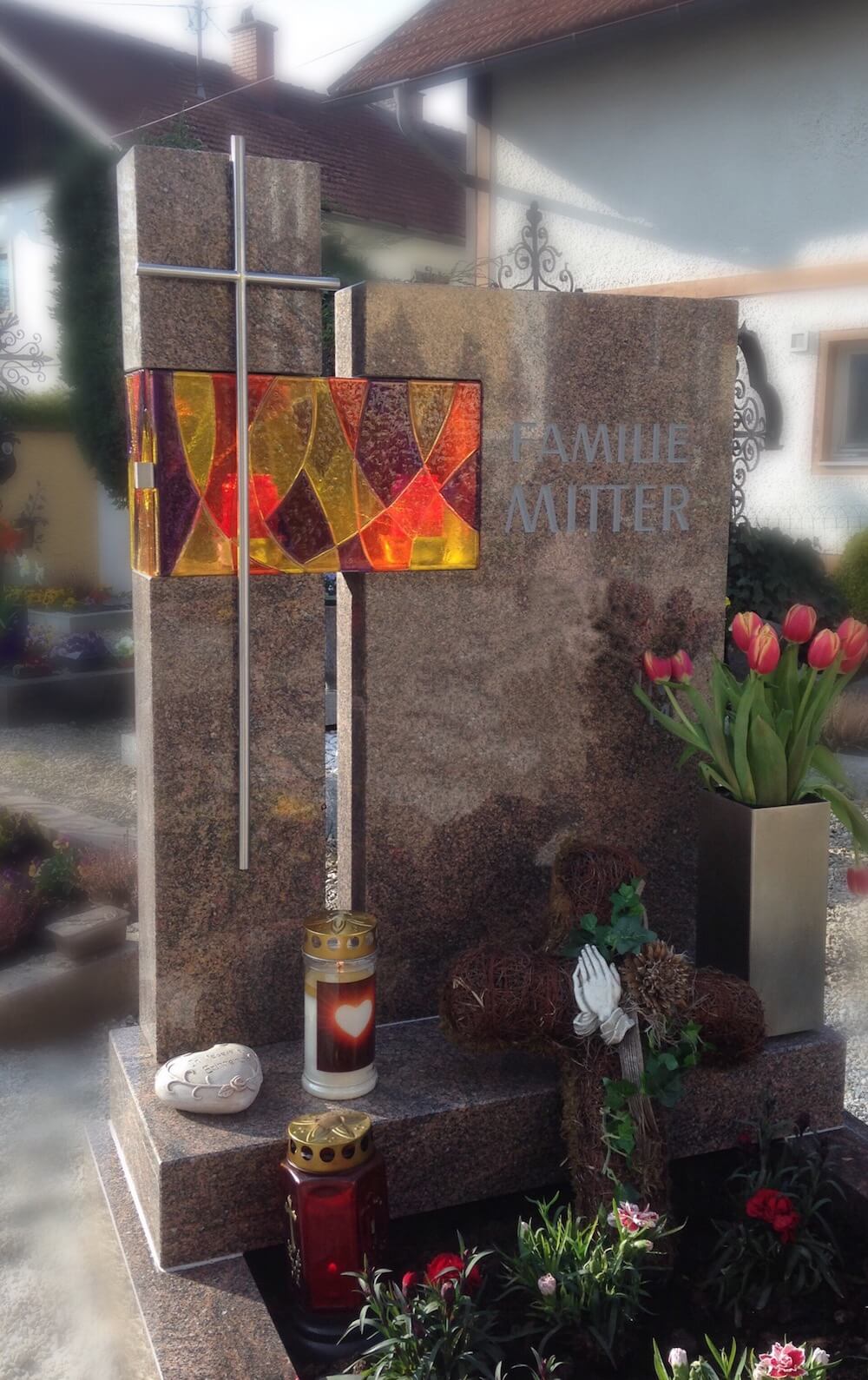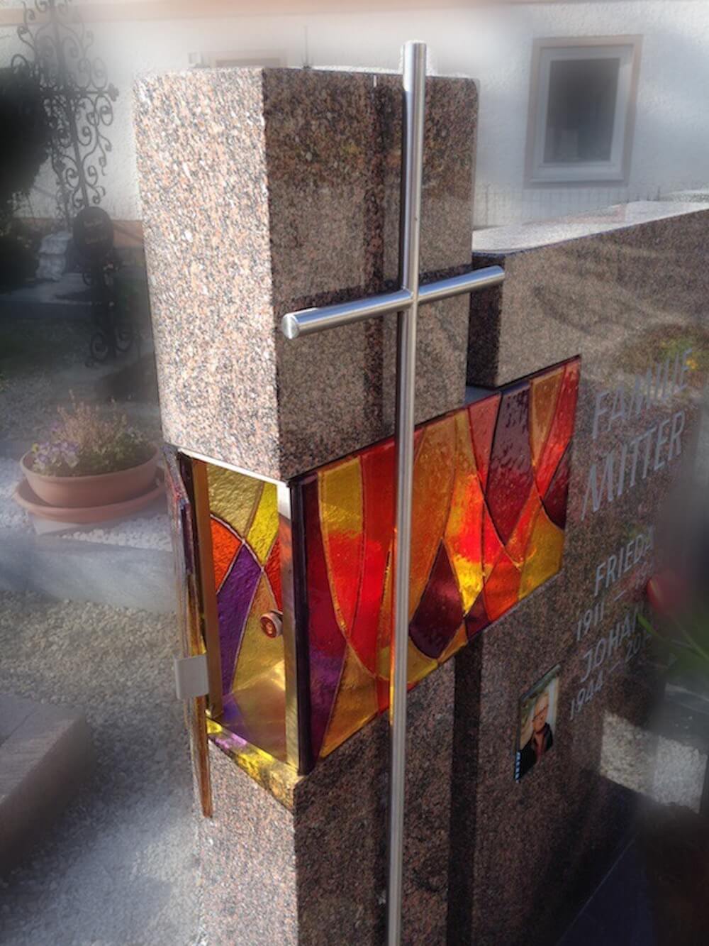 Einzelgrab Mitter Details Name: Mitter Standort: Hofkirchen an der Trattnach Grabstein: Wen aus einem alten Stein ein Kunstwerk wird. Der alte Stein der Familie wurde als Grundlage des neuen Grabsteins verwendet. Eine Glaslaterne mit aufwendig von Hand belegtem Schmelzglas verbindet die beiden Steine.