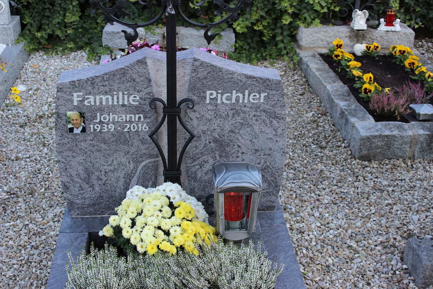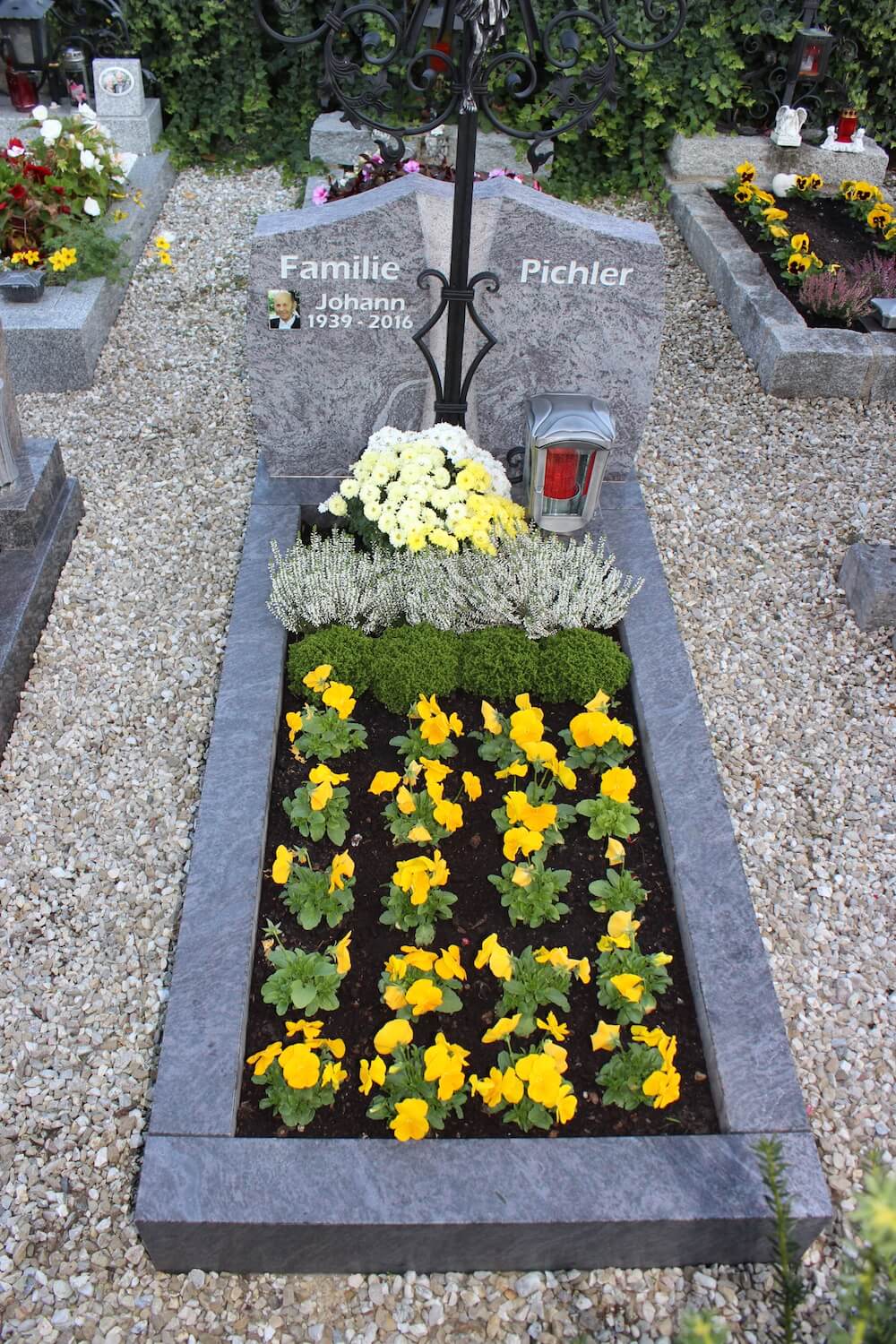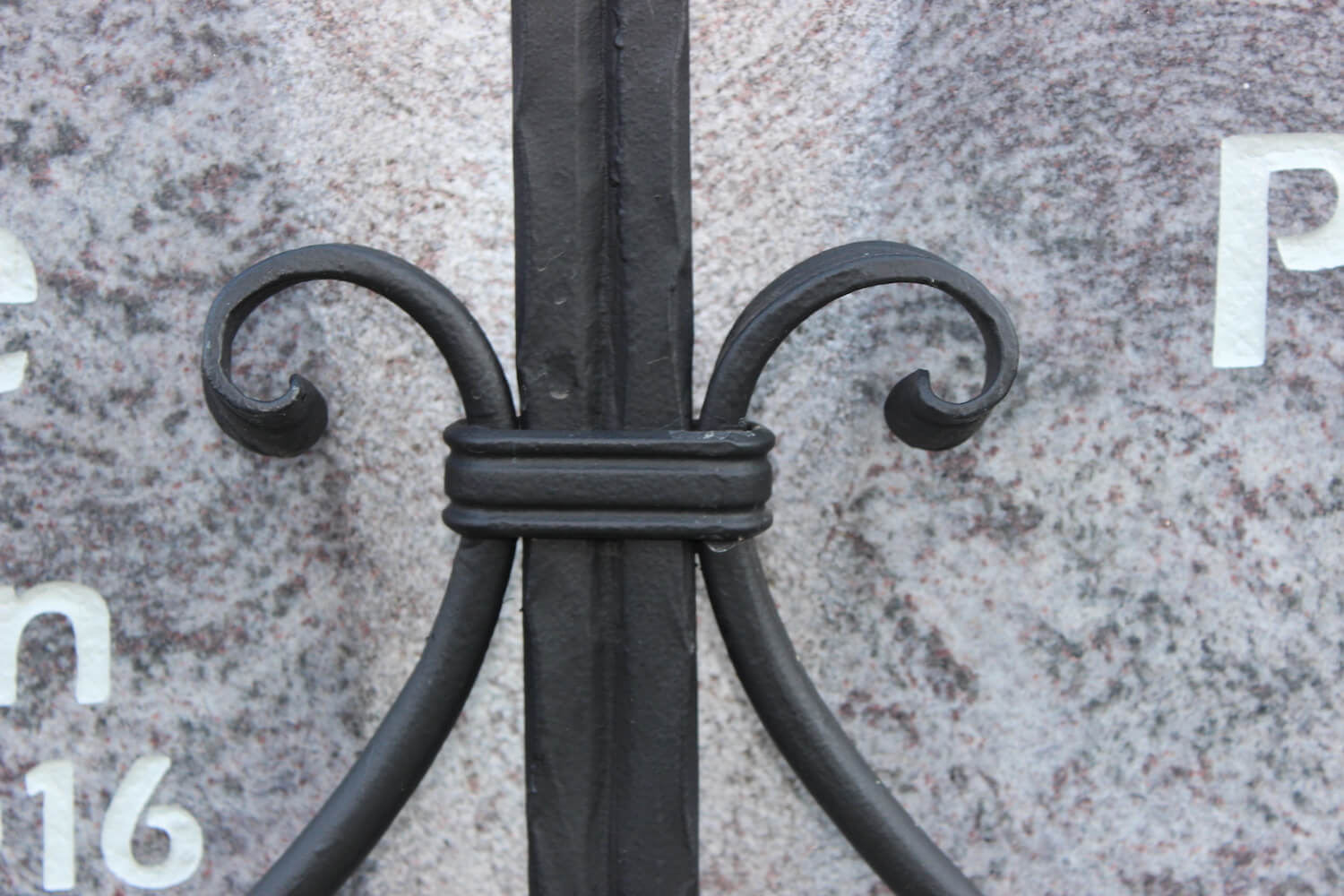Grabstein: Schmiedeeisenkreuze sind aus vielen Friedhöfen nicht wegzudenken. Umso schöner ist es, wenn wir alte Kreuze in die Neugestaltung miteinbinden dürfen. Zusätzilch zur Fertigung des passenden Schriftsteins wurde auch das Kreuz mit neuer Schmiedearbeit aufbereitet.