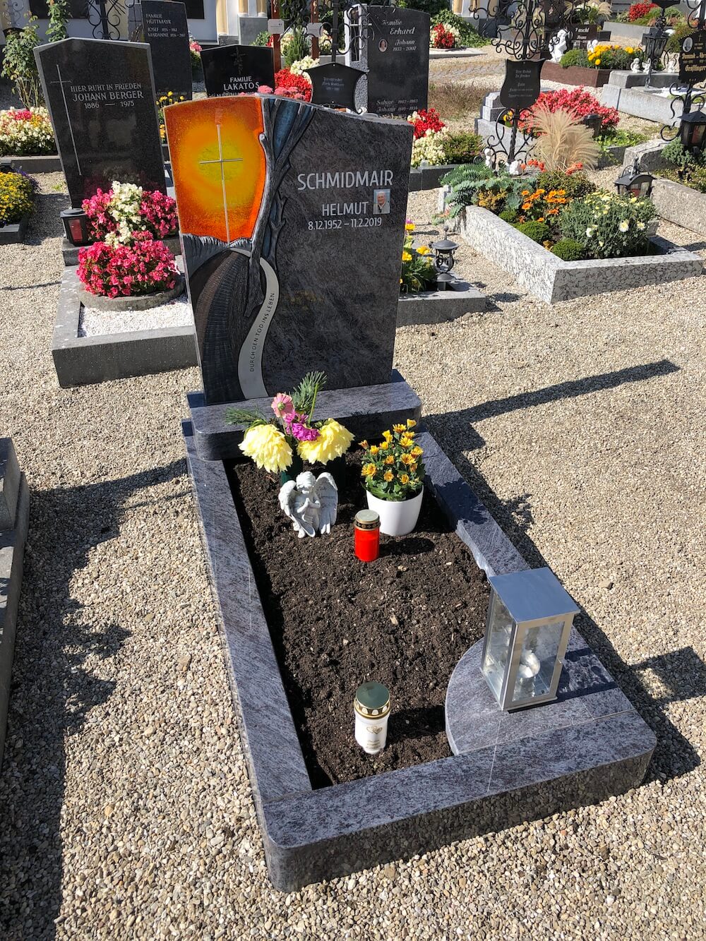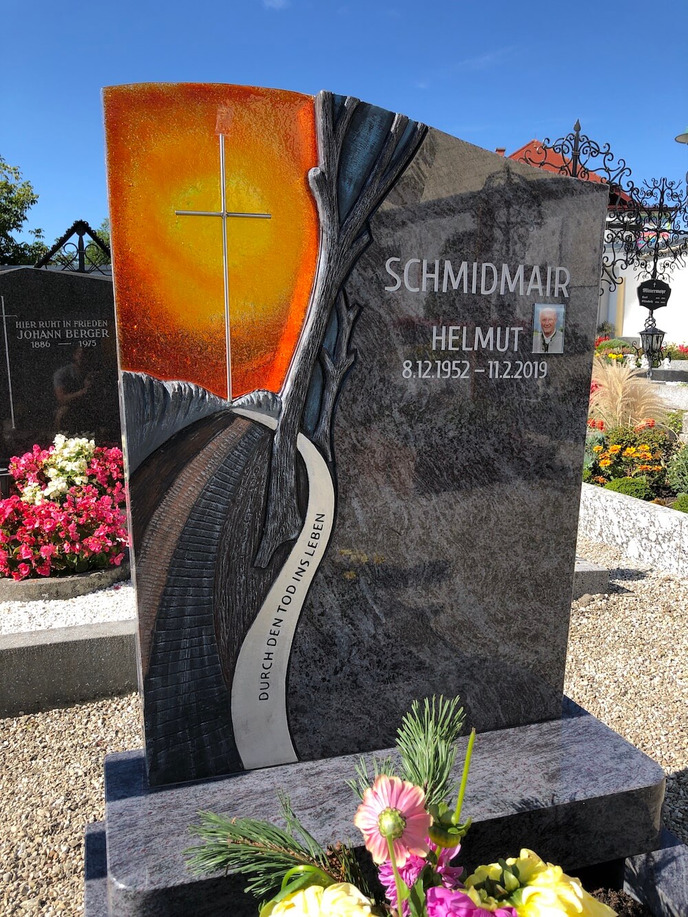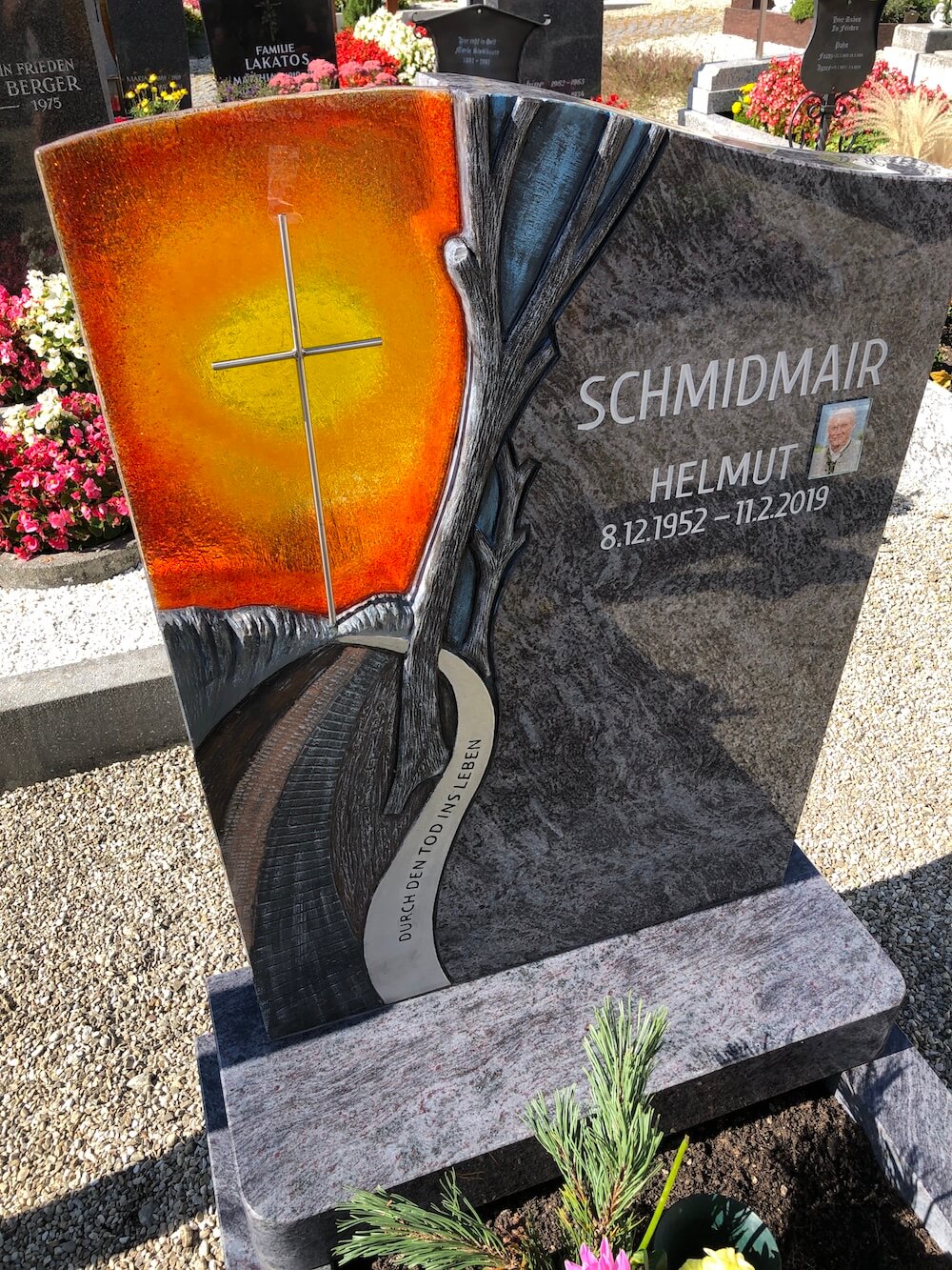 Einzelgrab Schmidmair Details Name: Schmidmair Standort: Puchkirchen am Trattberg Grabstein: Die abgerundeten Ecken bei der Grabumrandung und beim Grabsteinsockel lassen die Grabanlage einladender wirken. Das von uns entworfene Motiv wurde nach dem Herausarbeiten mit Farbe bemalt.