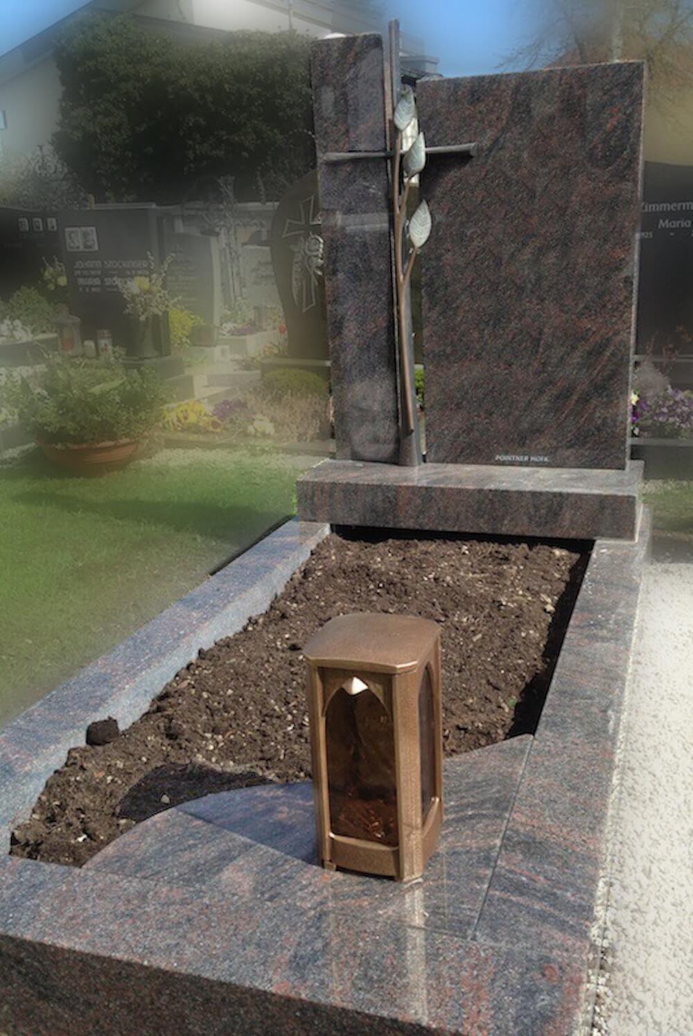 Einzelgrab Weibern 01 Details Standort: Weibern Grabstein: Das Bronzekreuz mit Blättern und seiner Sonderpatina ergänzt sich mit dem pflegeleichten Naturstein, eine Verschmelzung der Materialien.