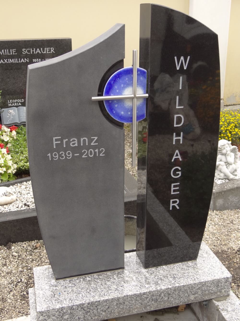 Grabstein: Dem alten Familiengrabstein wurde durch Abschleifen und einer neuen Formgebung ein „zweites Leben“ gegeben. Durch das Verwenden bestehender Materialien, die in ihrer Qualität hervorragend sind, geht der Bezug zur vorhergehenden Generation, die denn Grabstein gekauft hat, nicht verloren. Eine Win-win-Situation für Steinmetz und Kunde.