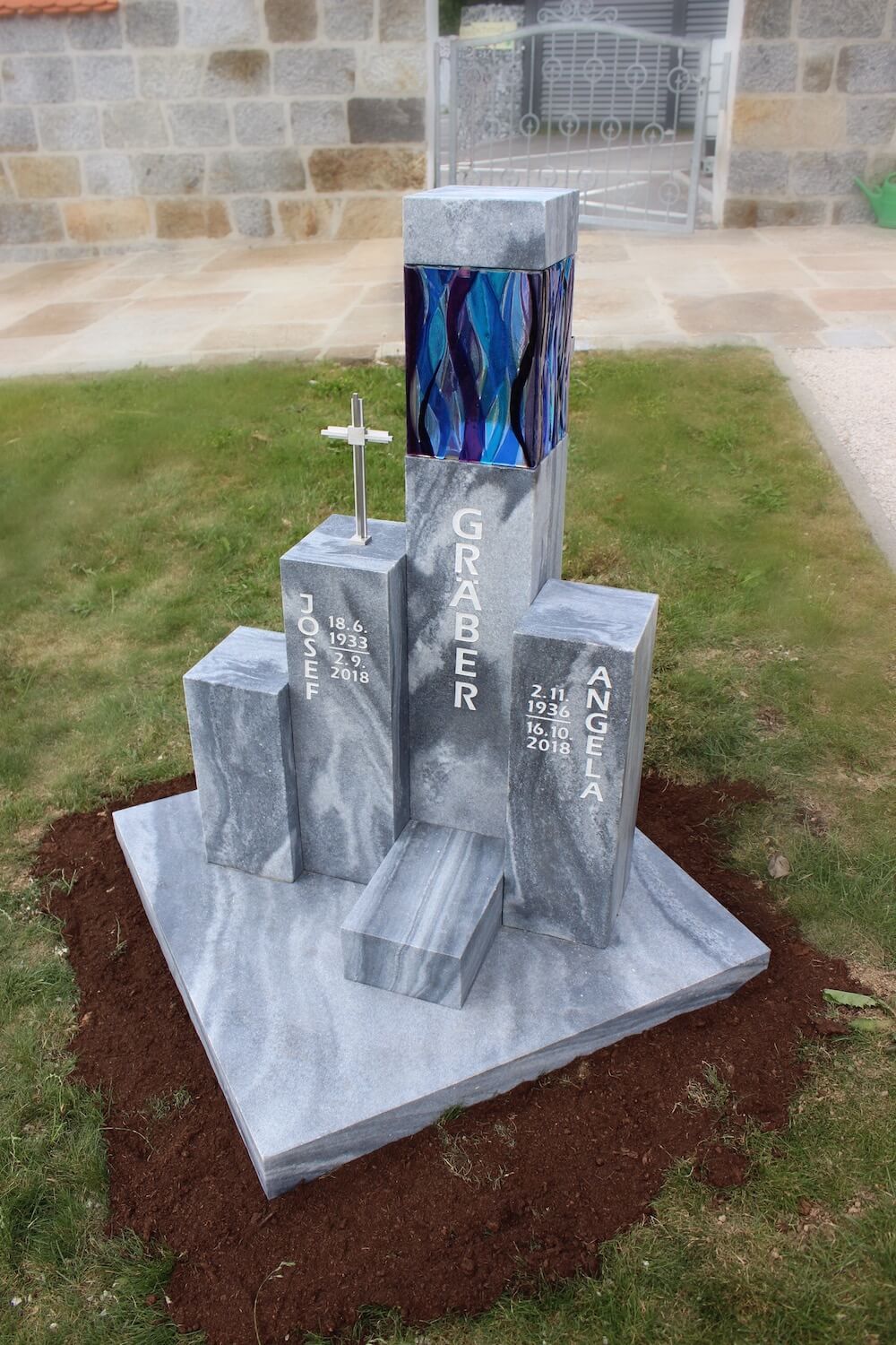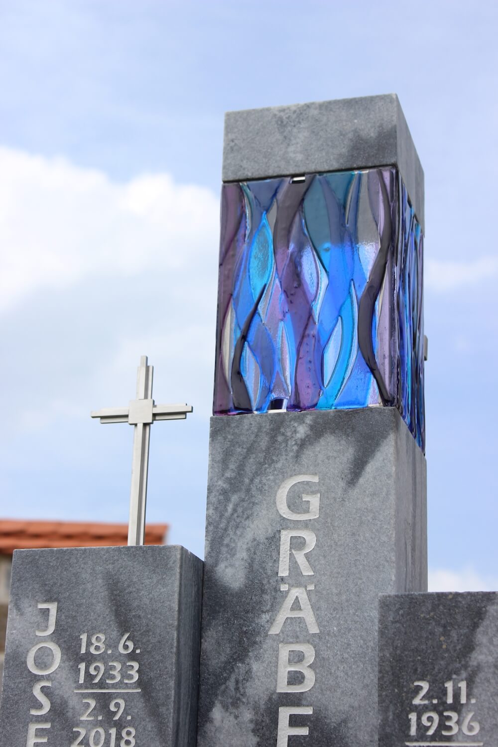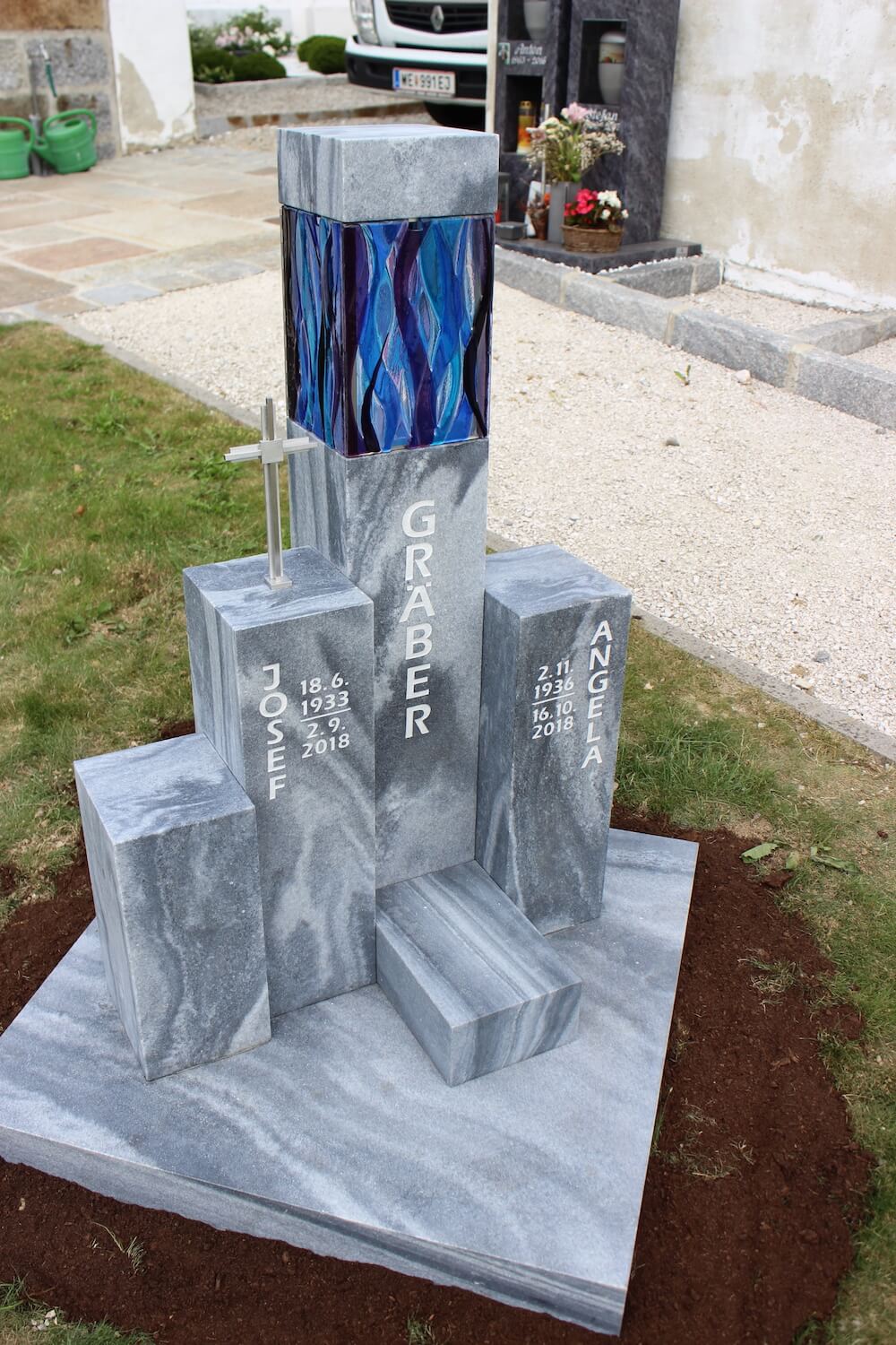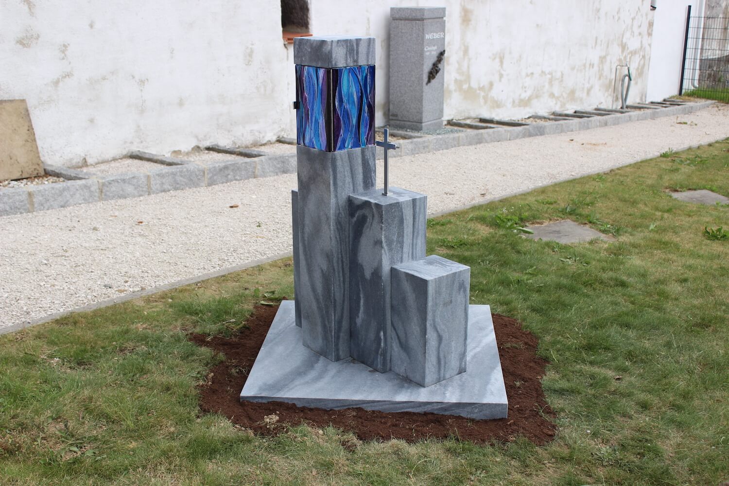 Grabstein: Das mühsame Bücken, um die Kerze auszuwechseln, hat ein Ende. Das ist unsere Antwort auf ergonomische Grabgestaltung, perfekt angepasst an die Grabgestaltung und an den Menschen. Die Musterung des verwendeten Wachauer Marmors wurde beim Schmelzglas übernommen und die Farben an den Stein angepasst.