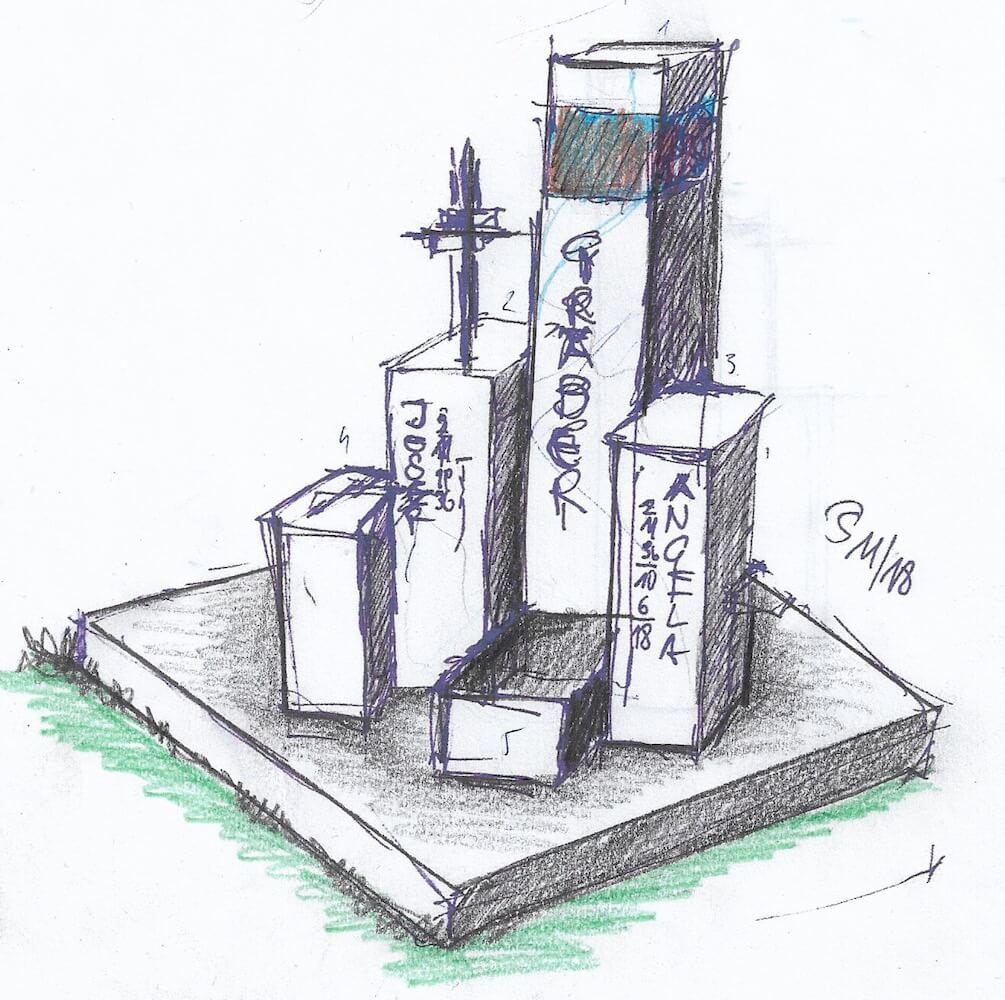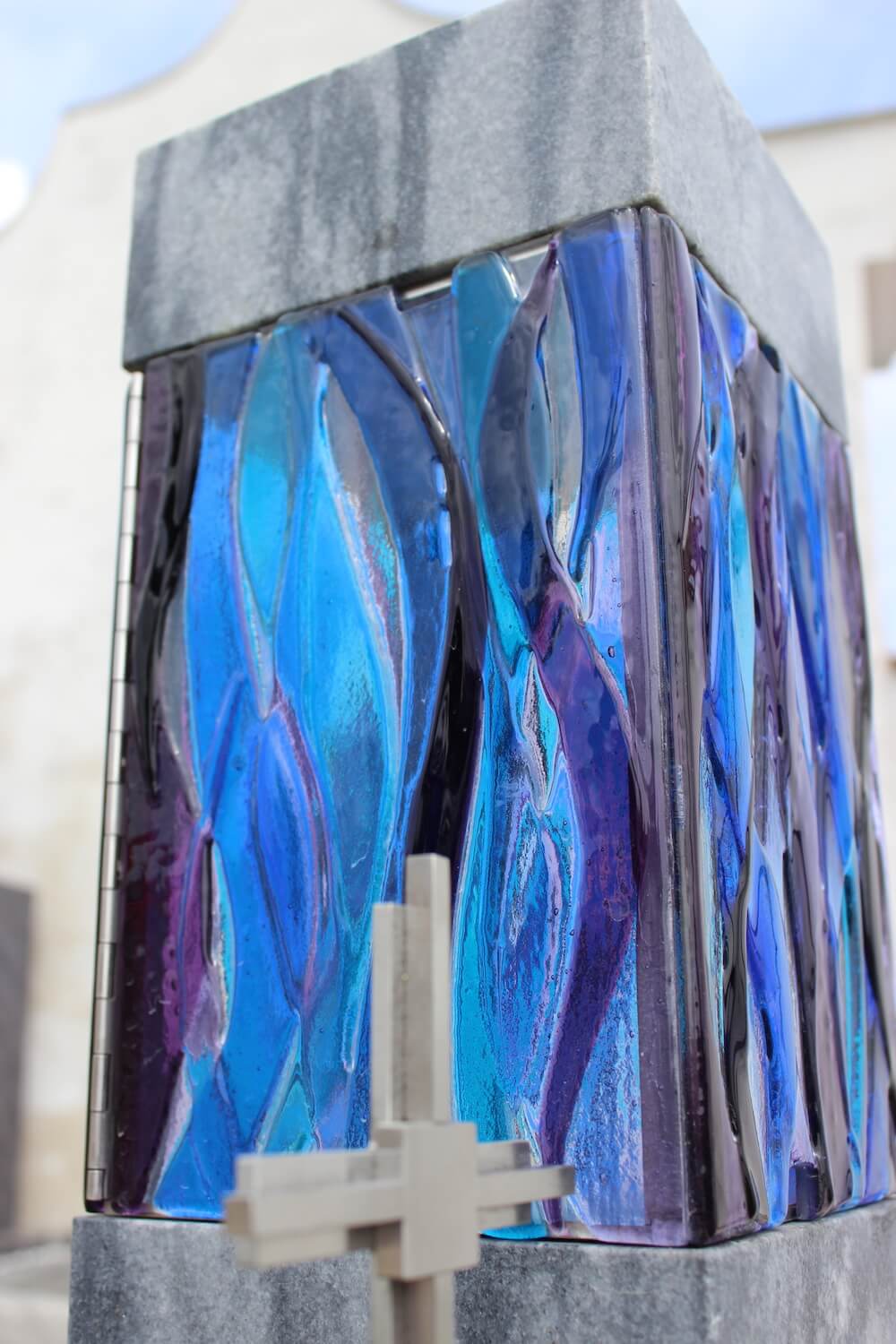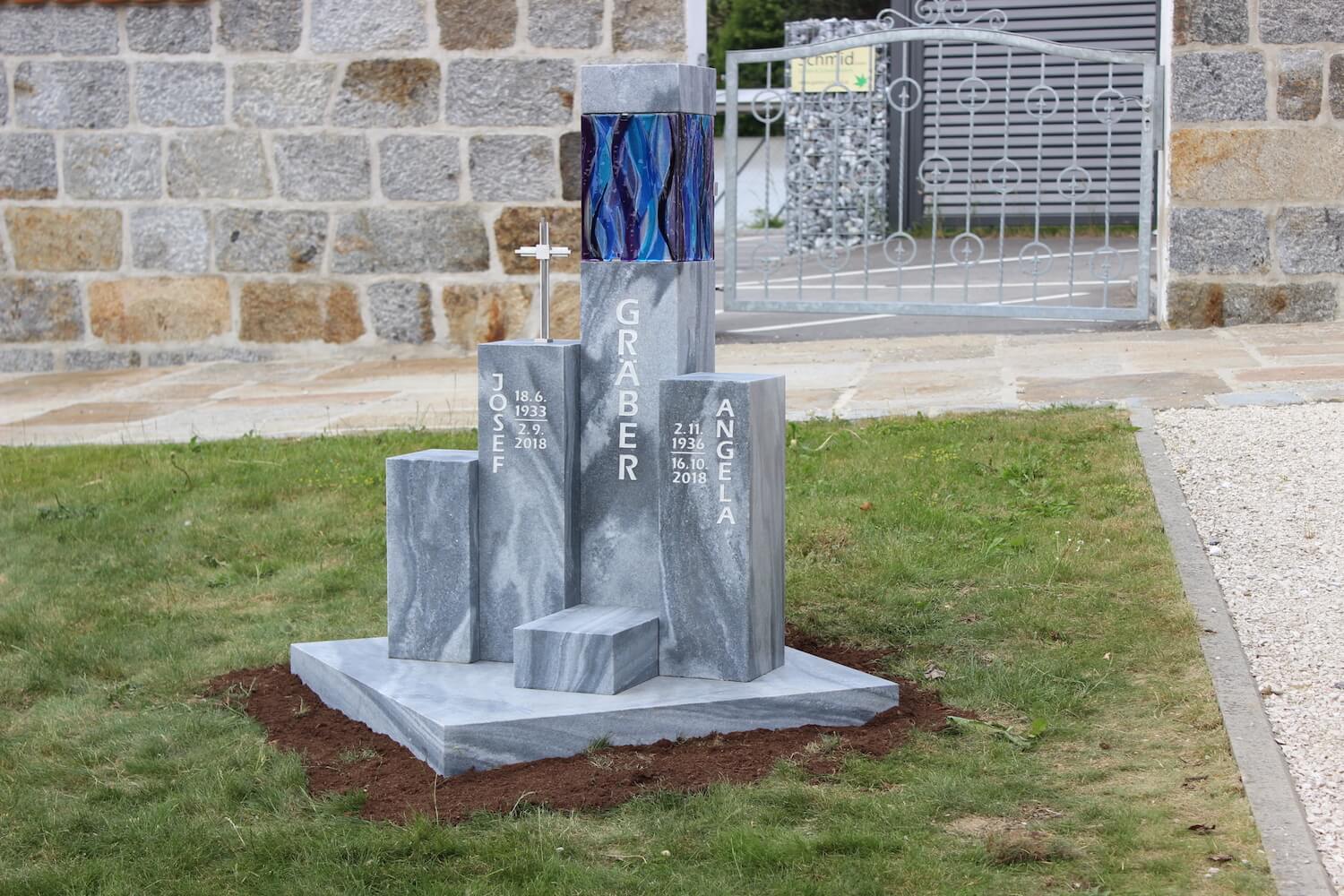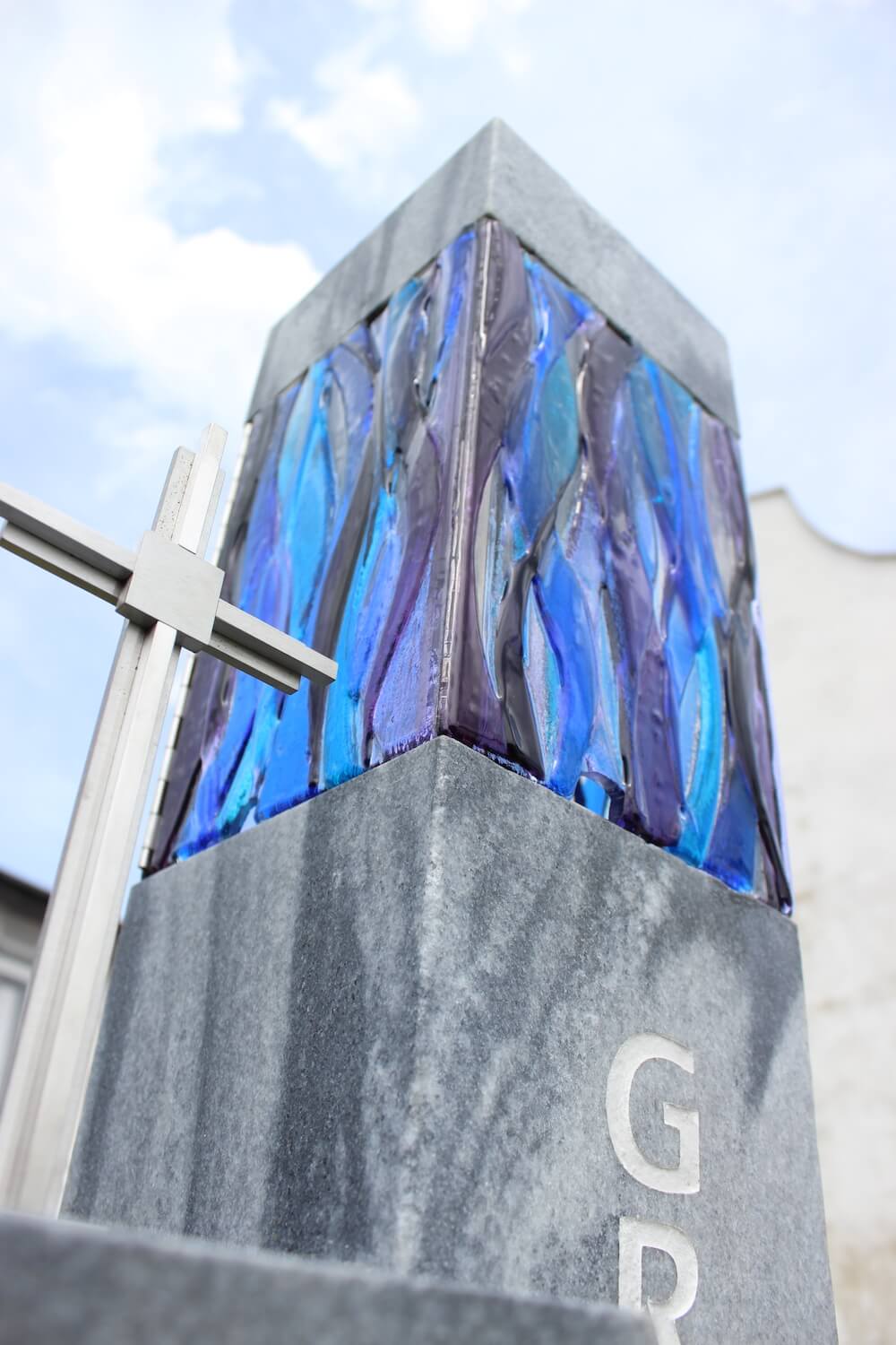 Grabstein: Das mühsame Bücken, um die Kerze auszuwechseln, hat ein Ende. Das ist unsere Antwort auf ergonomische Grabgestaltung, perfekt angepasst an die Grabgestaltung und an den Menschen. Die Musterung des verwendeten Wachauer Marmors wurde beim Schmelzglas übernommen und die Farben an den Stein angepasst.