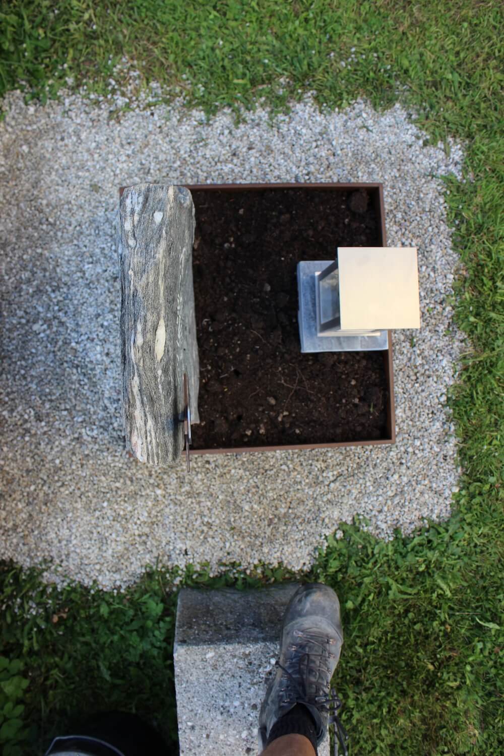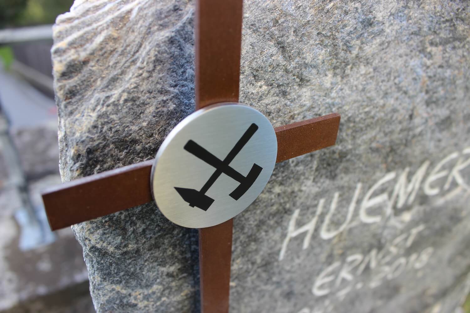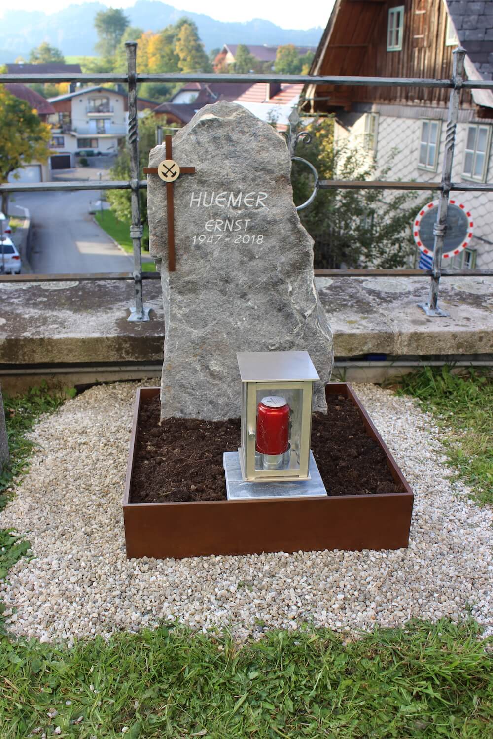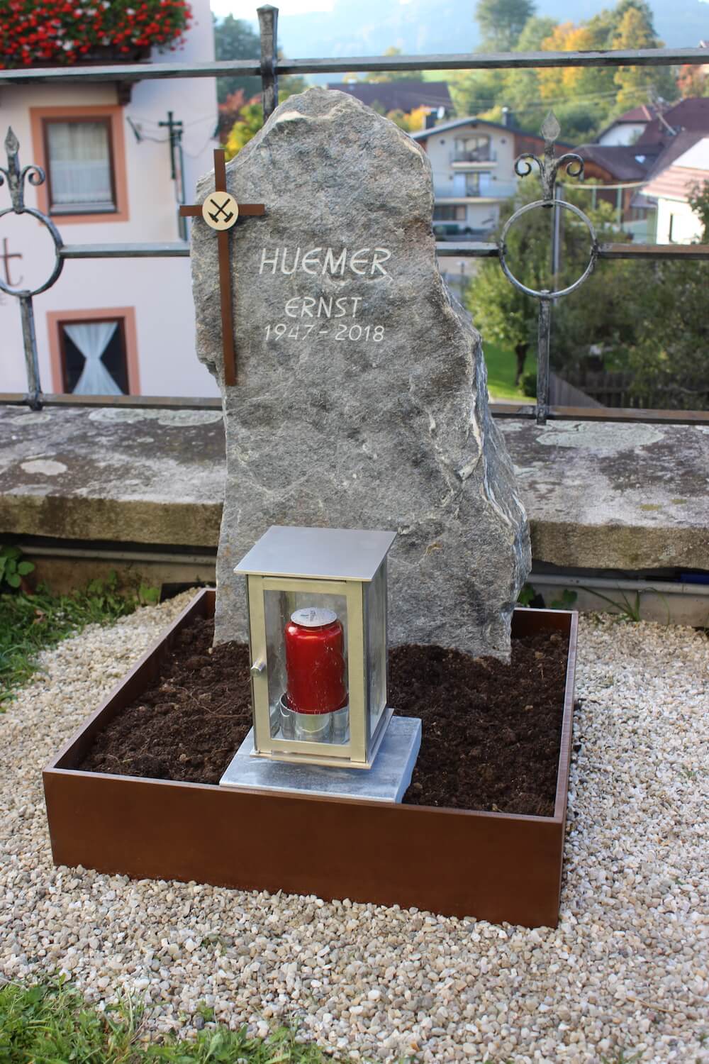 Urnengrab Huemer Details Name: Huemer Standort: Gebolskirchen Grabstein: Urnengrab für einen Bergmann: Material aus naturbelassenem Salzburger Marmor und verrostetem Stahl.