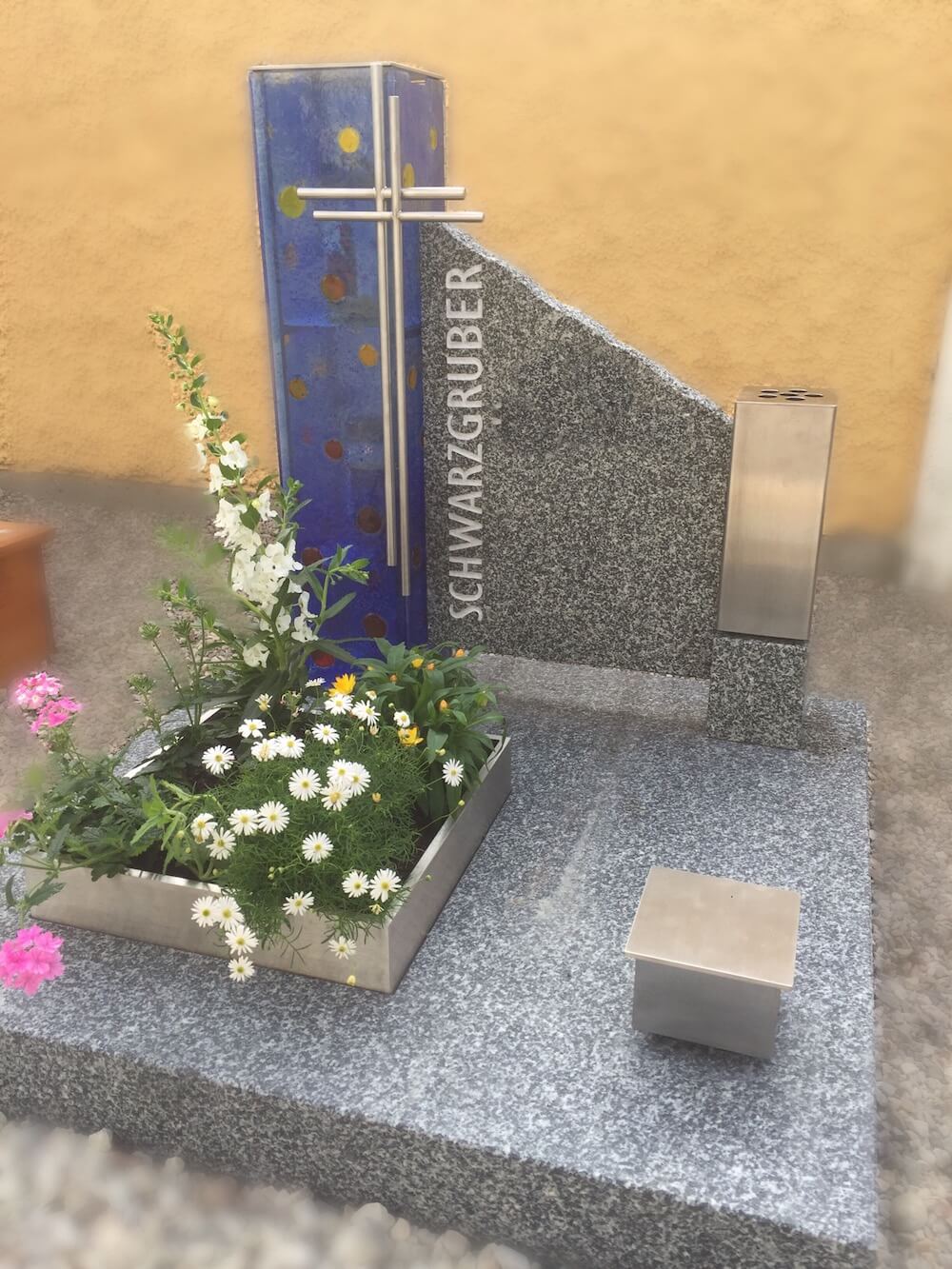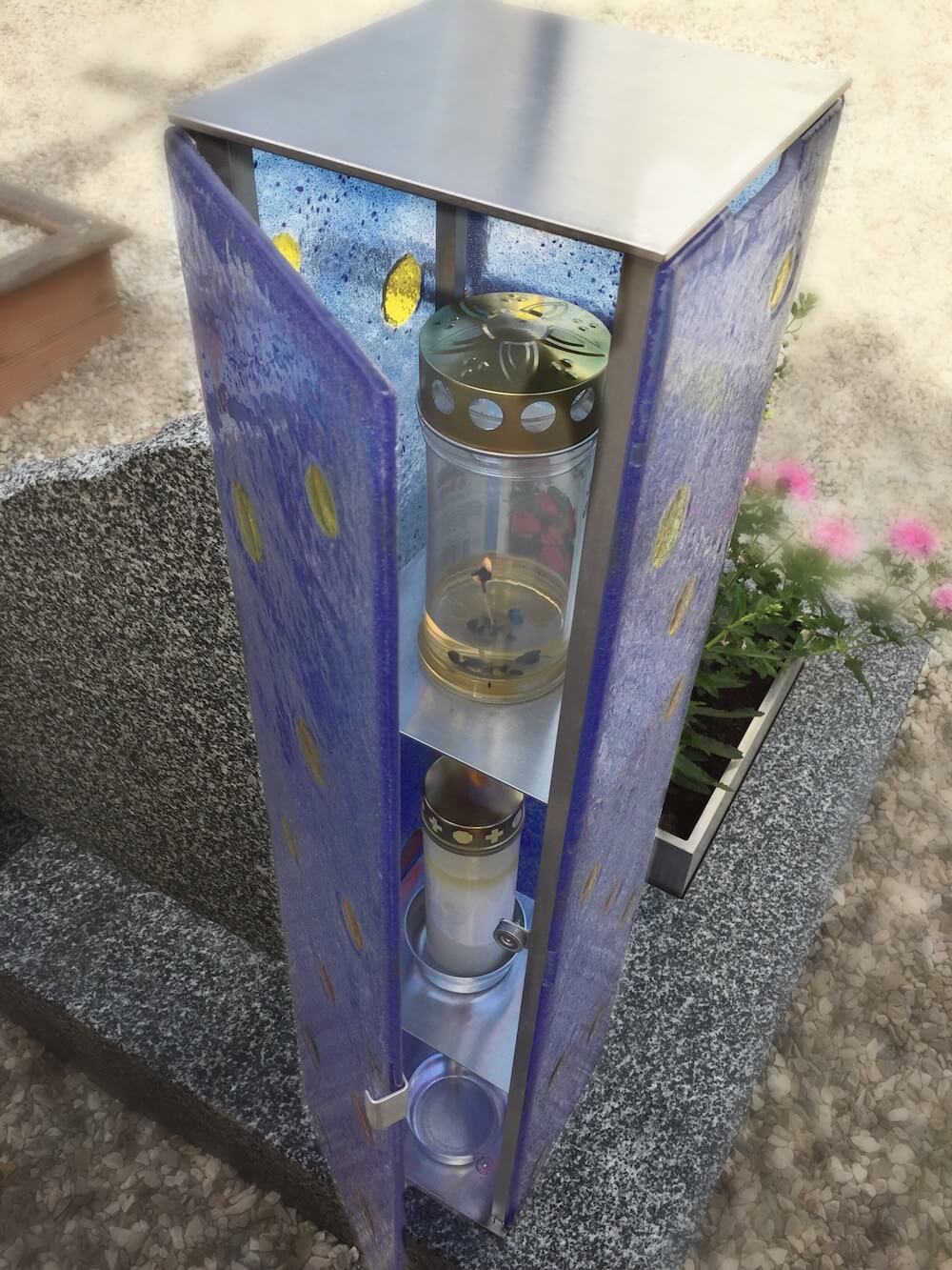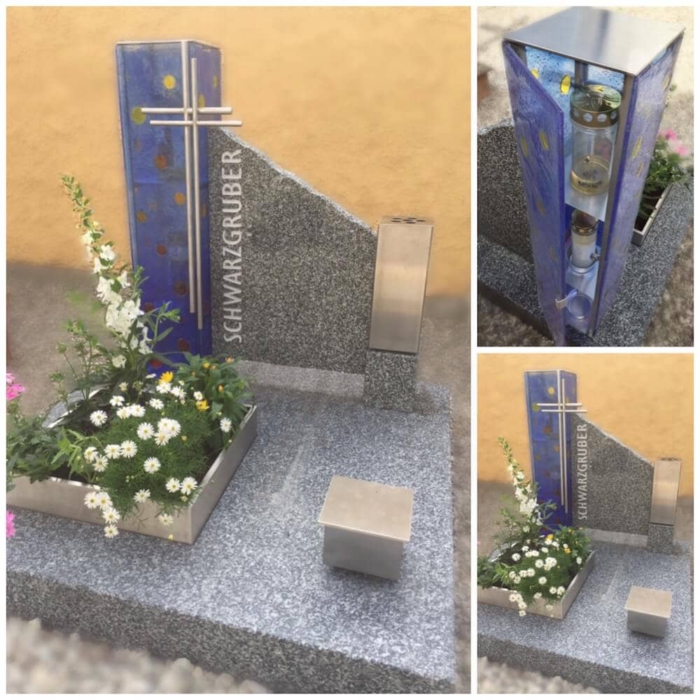 Grabstein: Eine Laterne, die in die Grabmalgestaltung integriert ist? Ja, das geht! Die Nurglaslaterne aus Schmelzglas wird nach Kundenwunsch in Farbe, Form und Größe individuell gestaltet. Die Bepflanzungsfläche ist bis zum Mutterboden durchgängig, eine einfache und dankbare Alternative zur Blumenschale.