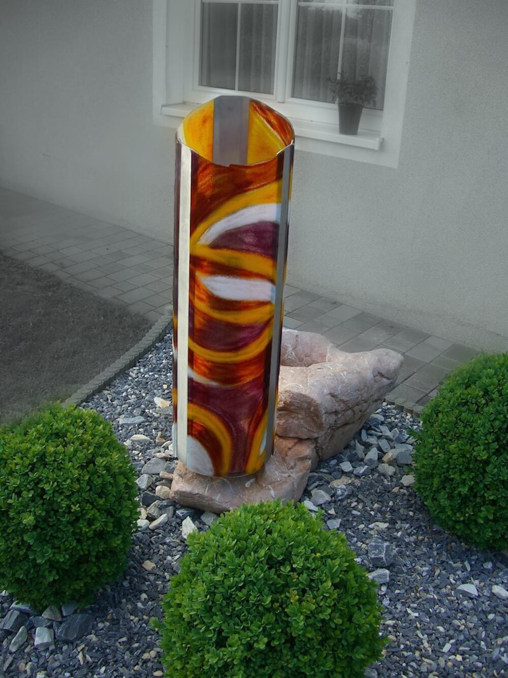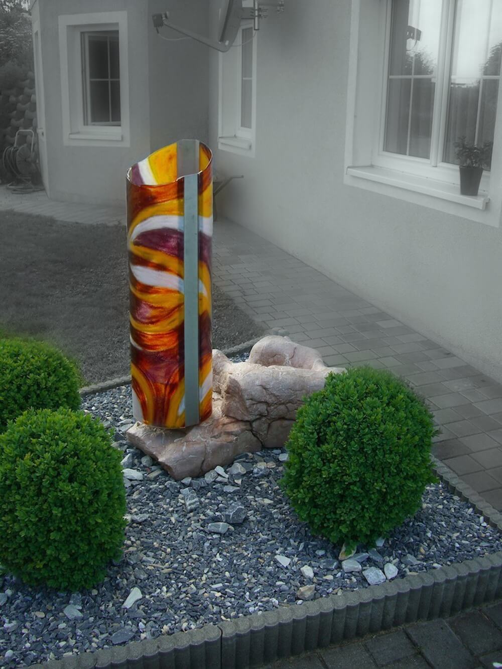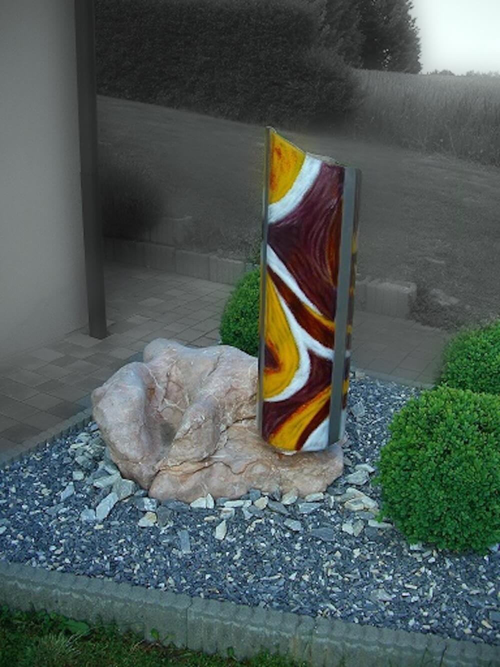 Grabstein: Bei dieser Gestaltung war es den Kunden ein Anliegen, dass der Grabplatz sich in die Umgebung des Gartens gut einfügt. Wir haben auf einen naturbelassenen Findling aus dem Dachsteingebiet und eine runde Glassäule gebaut, worin sich auch die Urne befindet. Gestalterisch lehnt sich das runde Glasobjekt perfekt in die Umgebung an.