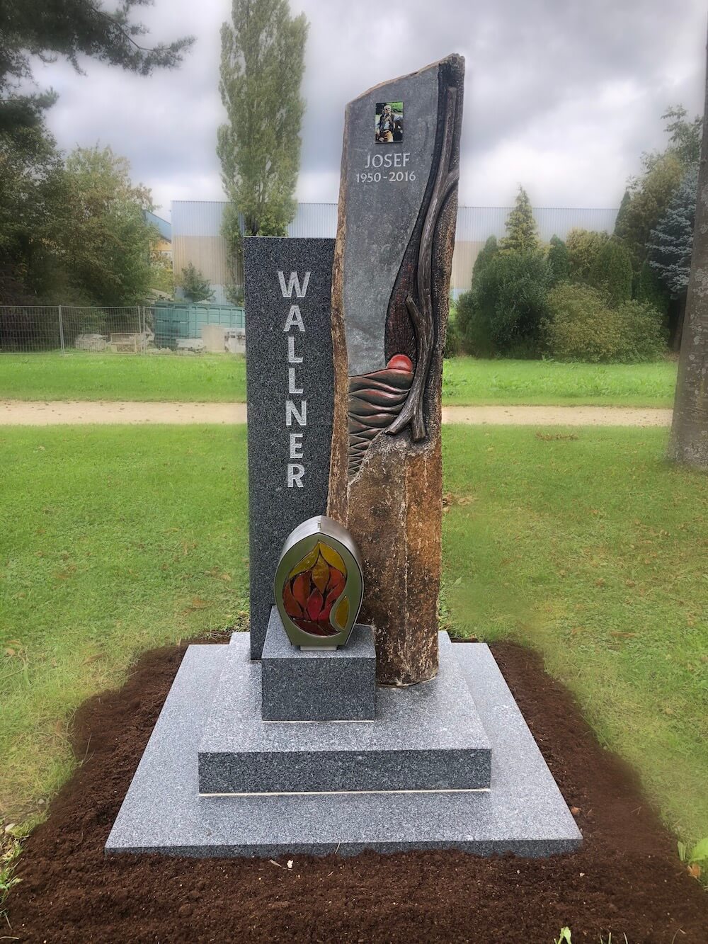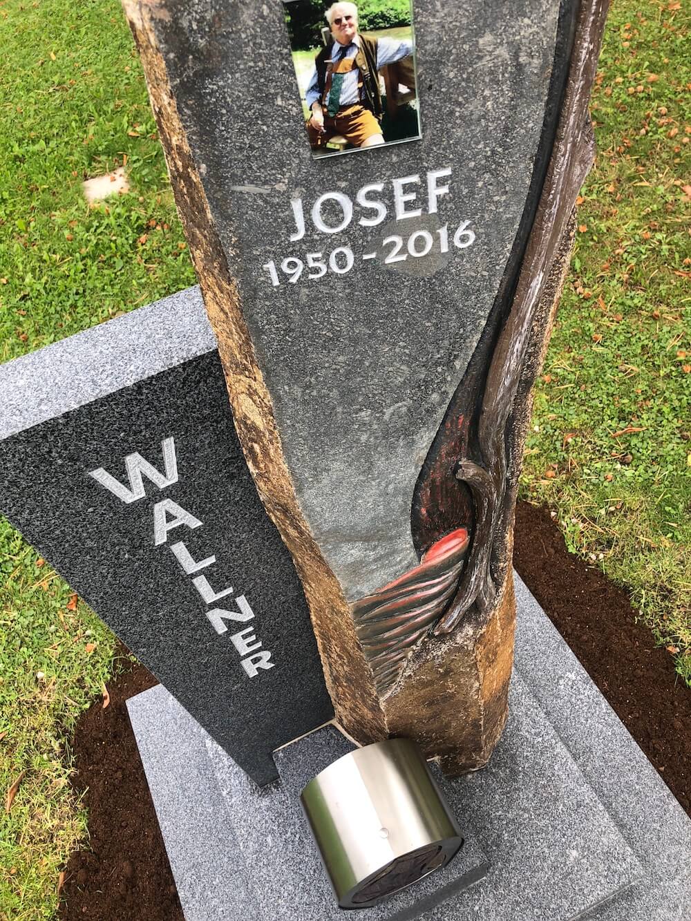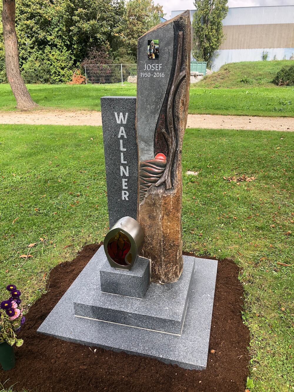 Grabstein: Das von Hand gearbeitete Motiv auf der Basaltstele bildet bei dieser Gestaltung den Mittelpunkt. Kombiniert wurde der Basalt mit einen Gebhartser Syenit aus Niederösterreich, der sich durch sein eher dunkleres Erscheinungsbild perfekt an den Basalt anpasst.