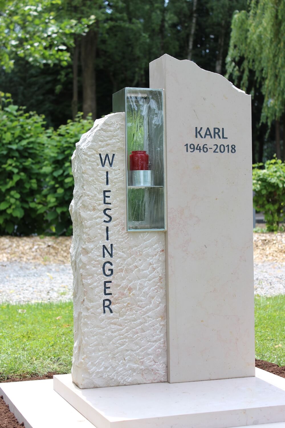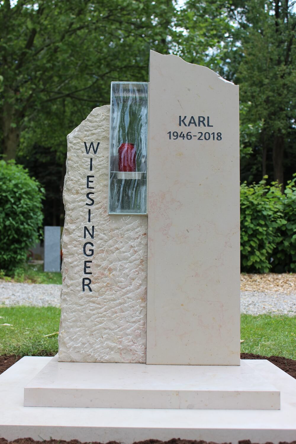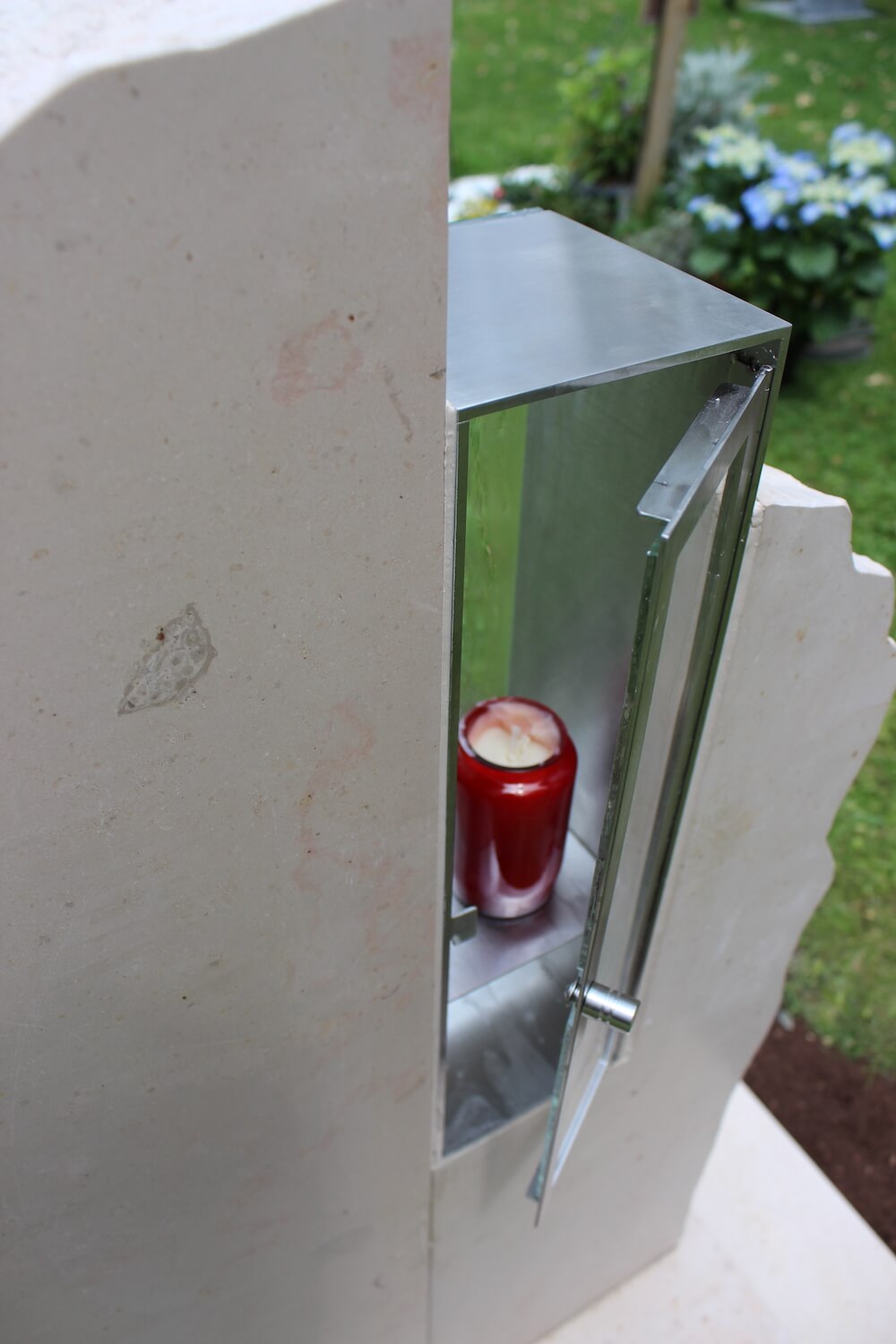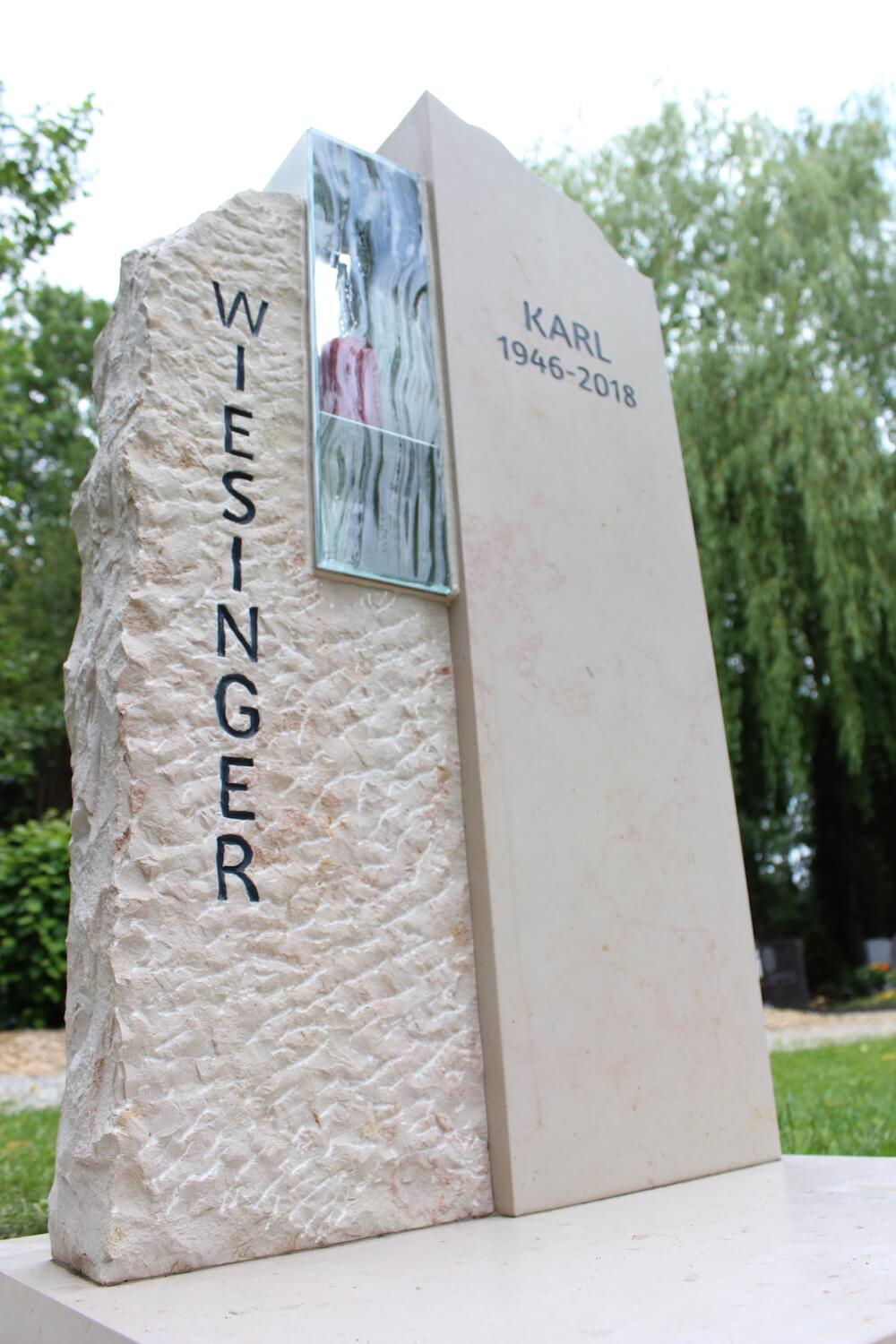 Grabstein: Frankreich ist nicht nur das Land der Baguettes, sondern auch der Steine. „Comblanchien“ heißt das verwendete Material. Bei richtiger Gestaltung ein cremefarbener Augenschmaus: klare Linien und handwerklich bearbeitete Flächen, ergänzt durch ein transparentes Wellenglas mit dazugehöriger Laterne, die extra für diesen Auftrag angefertigt wurden.