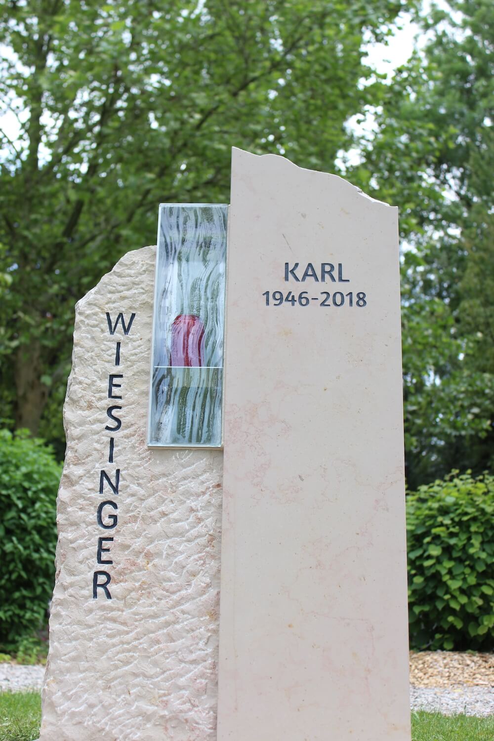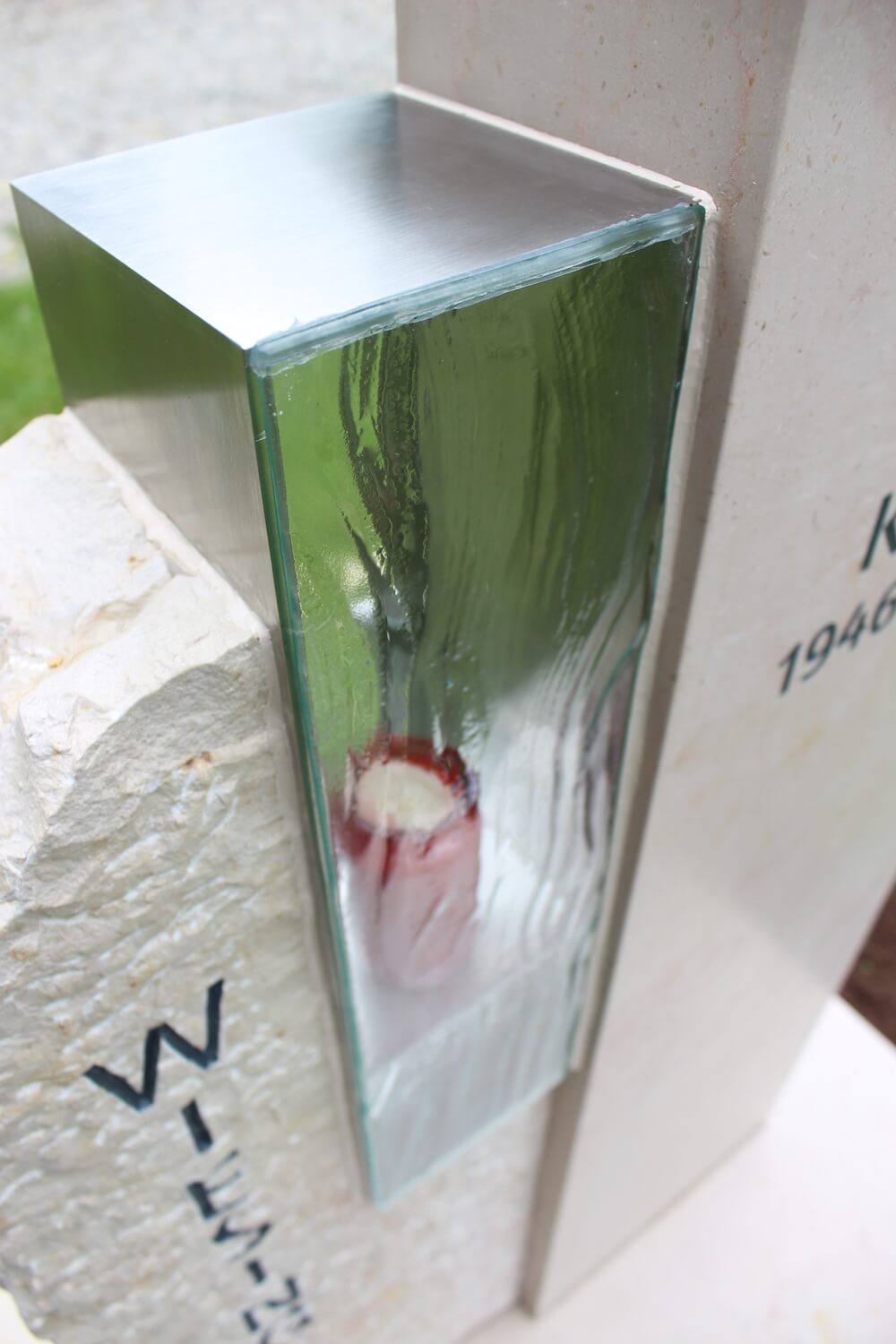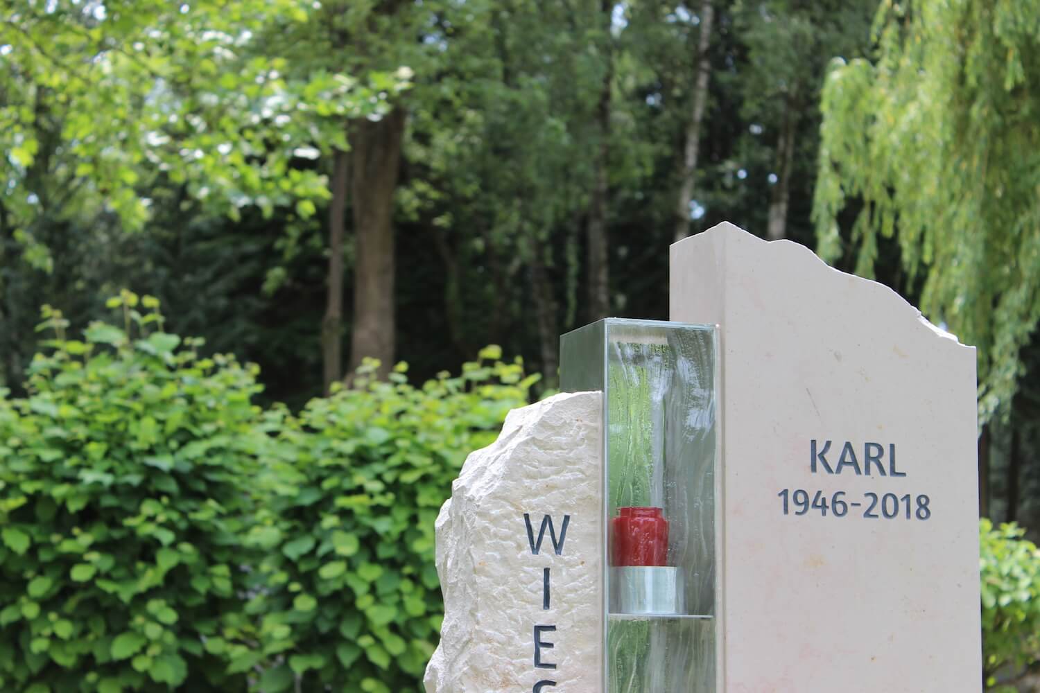 Grabstein: Frankreich ist nicht nur das Land der Baguettes, sondern auch der Steine. „Comblanchien“ heißt das verwendete Material. Bei richtiger Gestaltung ein cremefarbener Augenschmaus: klare Linien und handwerklich bearbeitete Flächen, ergänzt durch ein transparentes Wellenglas mit dazugehöriger Laterne, die extra für diesen Auftrag angefertigt wurden.