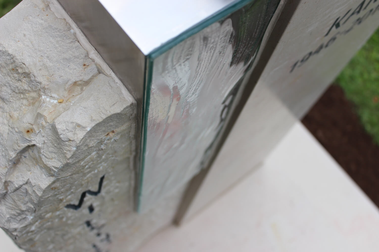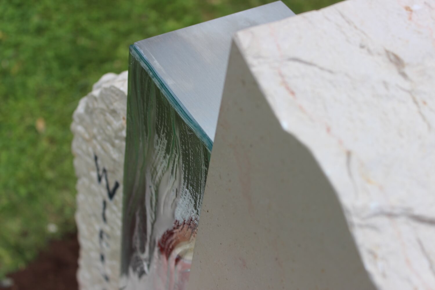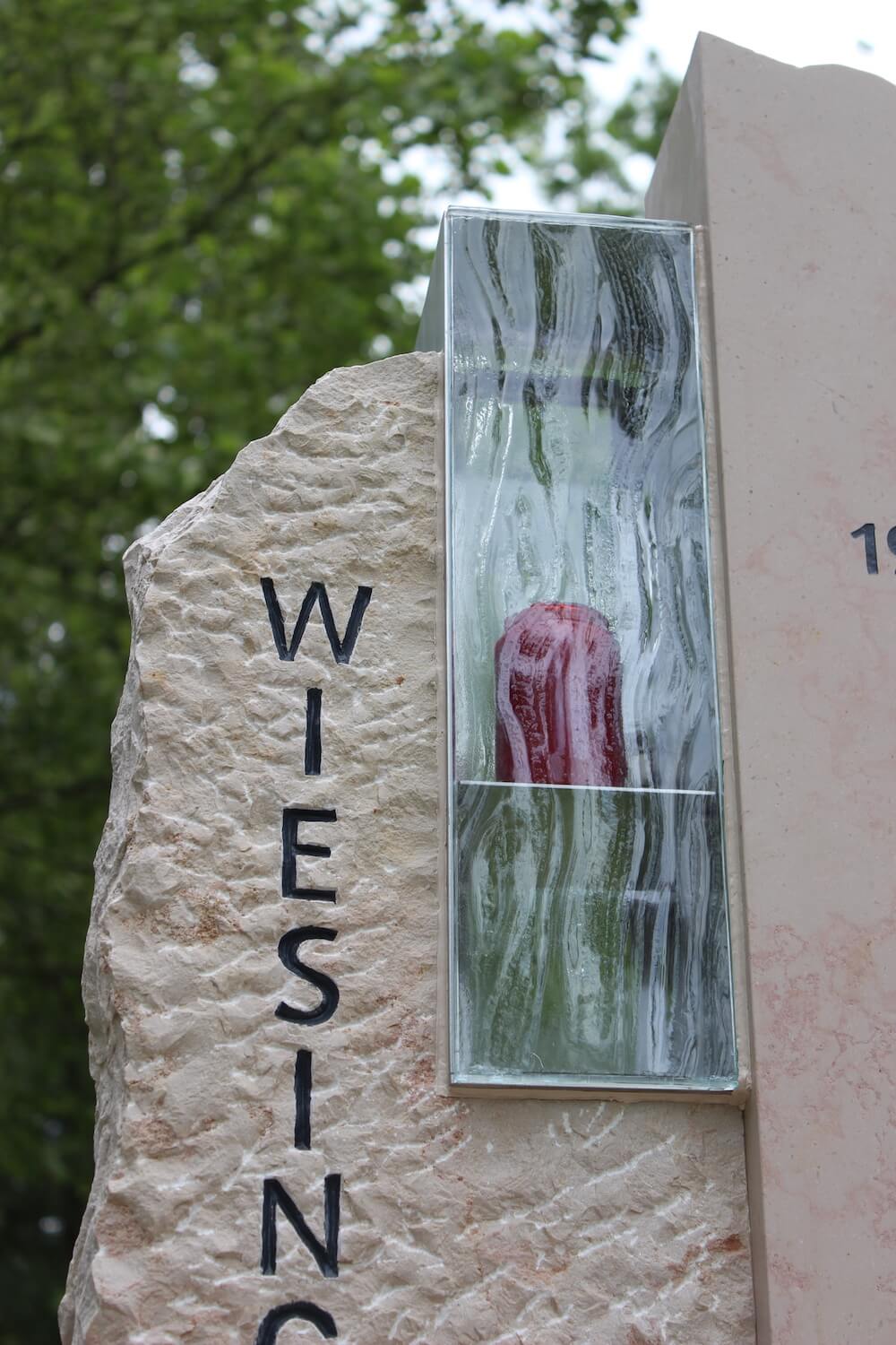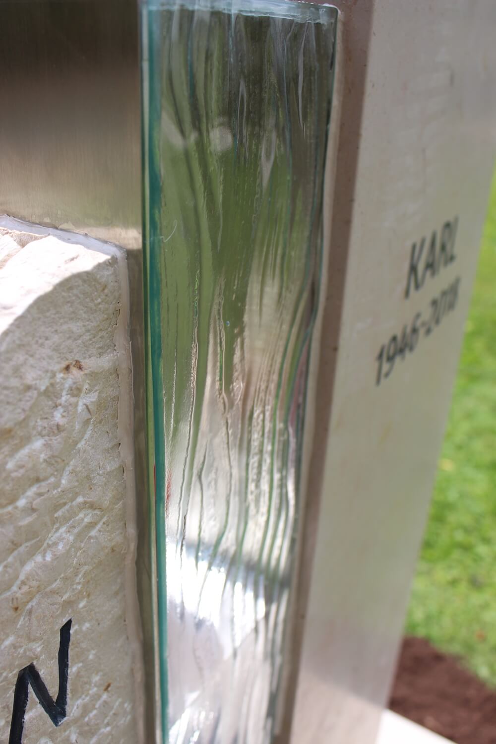 Grabstein: Frankreich ist nicht nur das Land der Baguettes, sondern auch der Steine. „Comblanchien“ heißt das verwendete Material. Bei richtiger Gestaltung ein cremefarbener Augenschmaus: klare Linien und handwerklich bearbeitete Flächen, ergänzt durch ein transparentes Wellenglas mit dazugehöriger Laterne, die extra für diesen Auftrag angefertigt wurden.