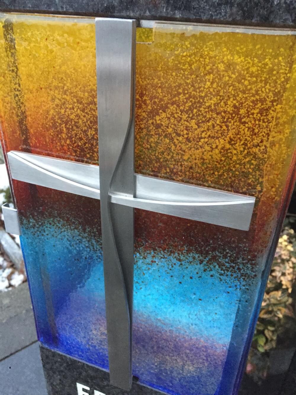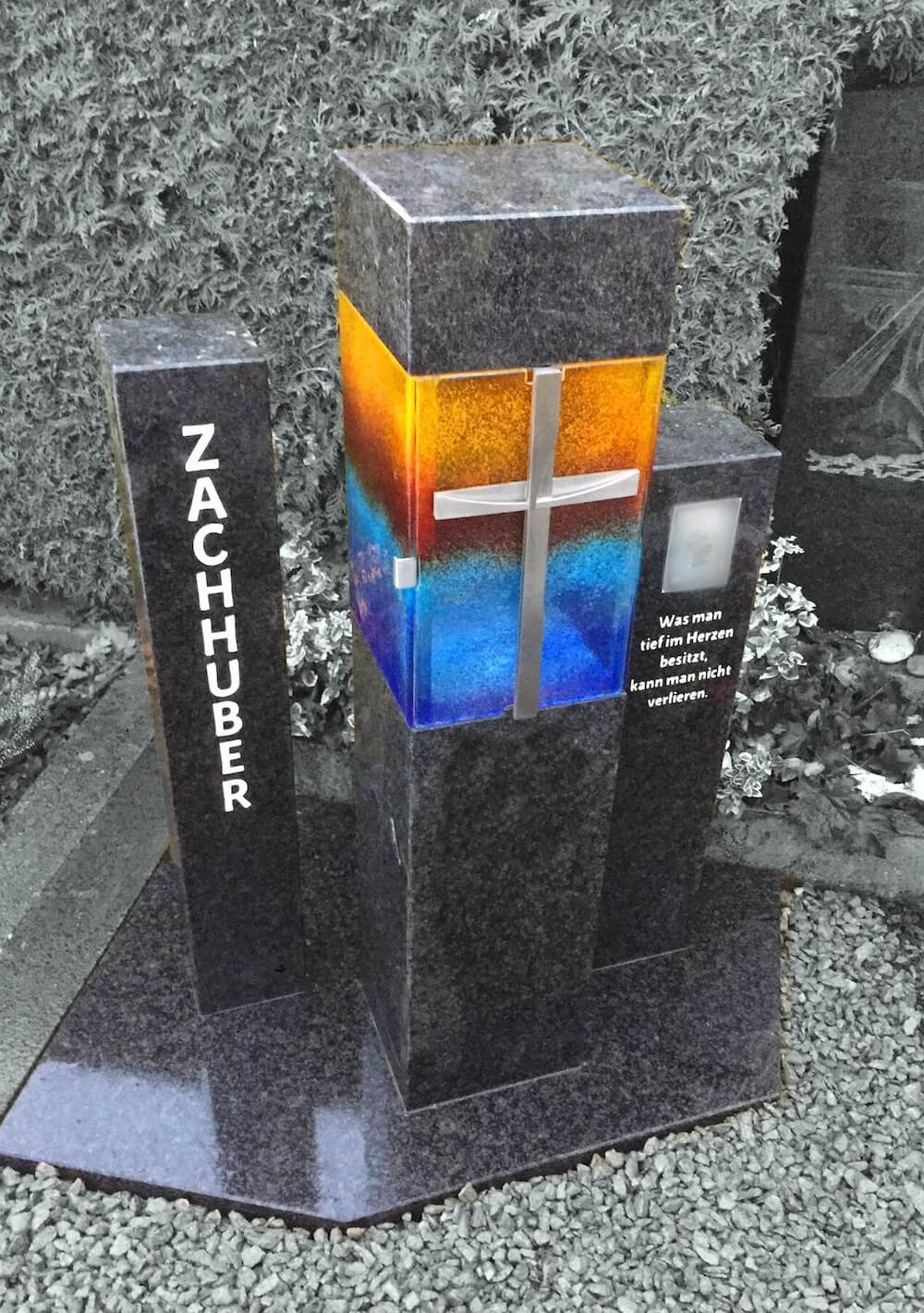 Grabstein: Bücher, Beistelltafeln aus Naturstein, Bronze- oder Edelstahltafeln und -schriften sieht man bei den meisten Grabstätten. Gestalterisch nicht immer schön, meistens eher eine Notwenigkeit, wenn die Schrift nicht auf den Grabstein soll oder kann. Wir boten ene neue und etwas andere Lösung, indem wir einen eigenen Bereich in die Grabstätte integrierten. Die Nurglaslaterne aus Schmelzglas macht diesen auf Säulen aufbauenden Entwurf zu etwas ganz Außergewöhnlichem.