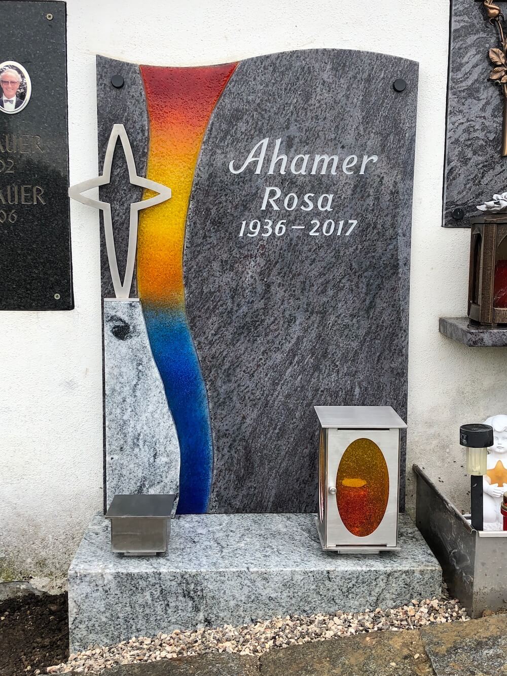 Urnenplatten Ahamer Details Name: Ahamer Standort: Zell an der Pram Grabstein: Der Wunsch des Kunden: keine quadratische Steinplatte wie die anderen zu haben. Hier die Umsetzung.